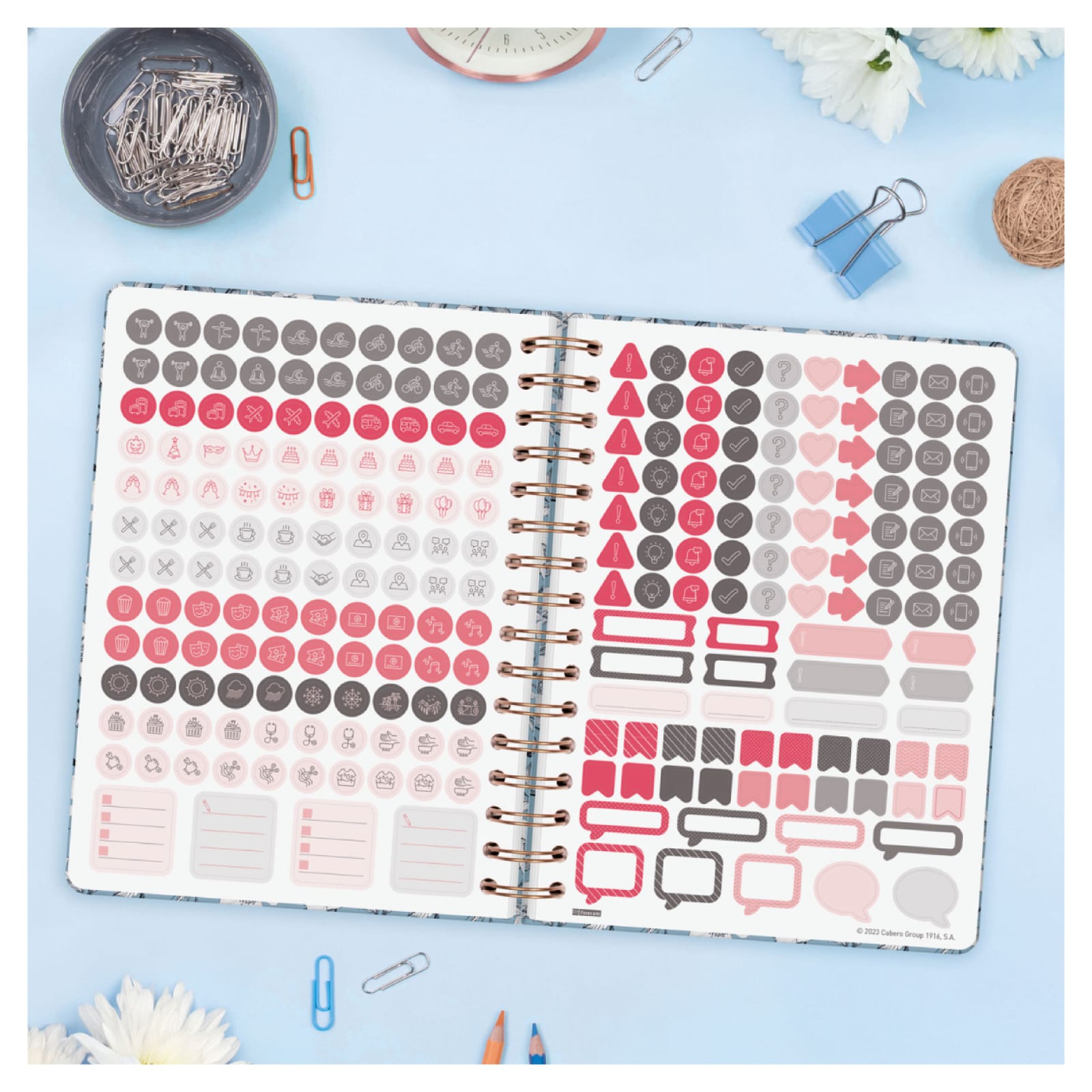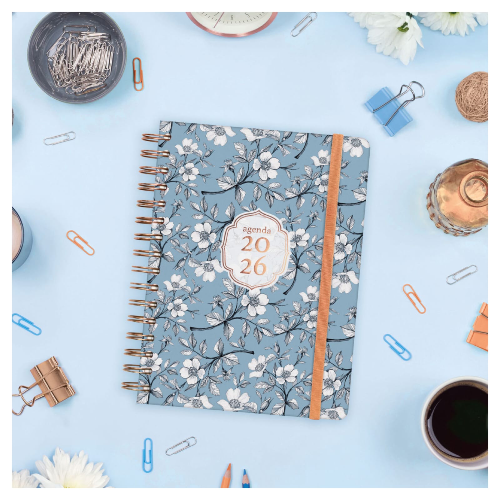Agenda espiral com capa dura feita de papelão forrada com filme fosco resistente a arranhões. Design elegante e moderno com detalhes impressos metálicos. Ideal para uso pessoal e/ou profissional. Com elástico e cantos microperfurados para localizar rapidamente o dia/semana atual. O design de interiores é limpo e fácil, com espaço suficiente para organizar seus projetos, tarefas e compromissos. Contém informações de interesse na anuidade e outros extras para organização pessoal. Além disso, inclui um conjunto de adesivos temáticos.
