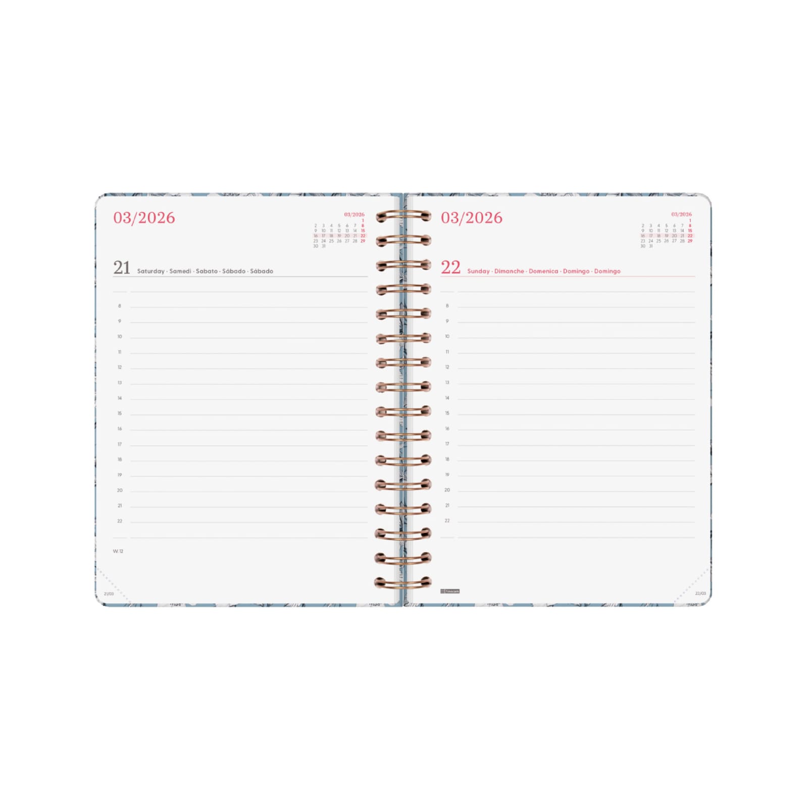 Amplo espaço para escrita para todos os dias. Com horas. Sábados e domingos em página inteira.