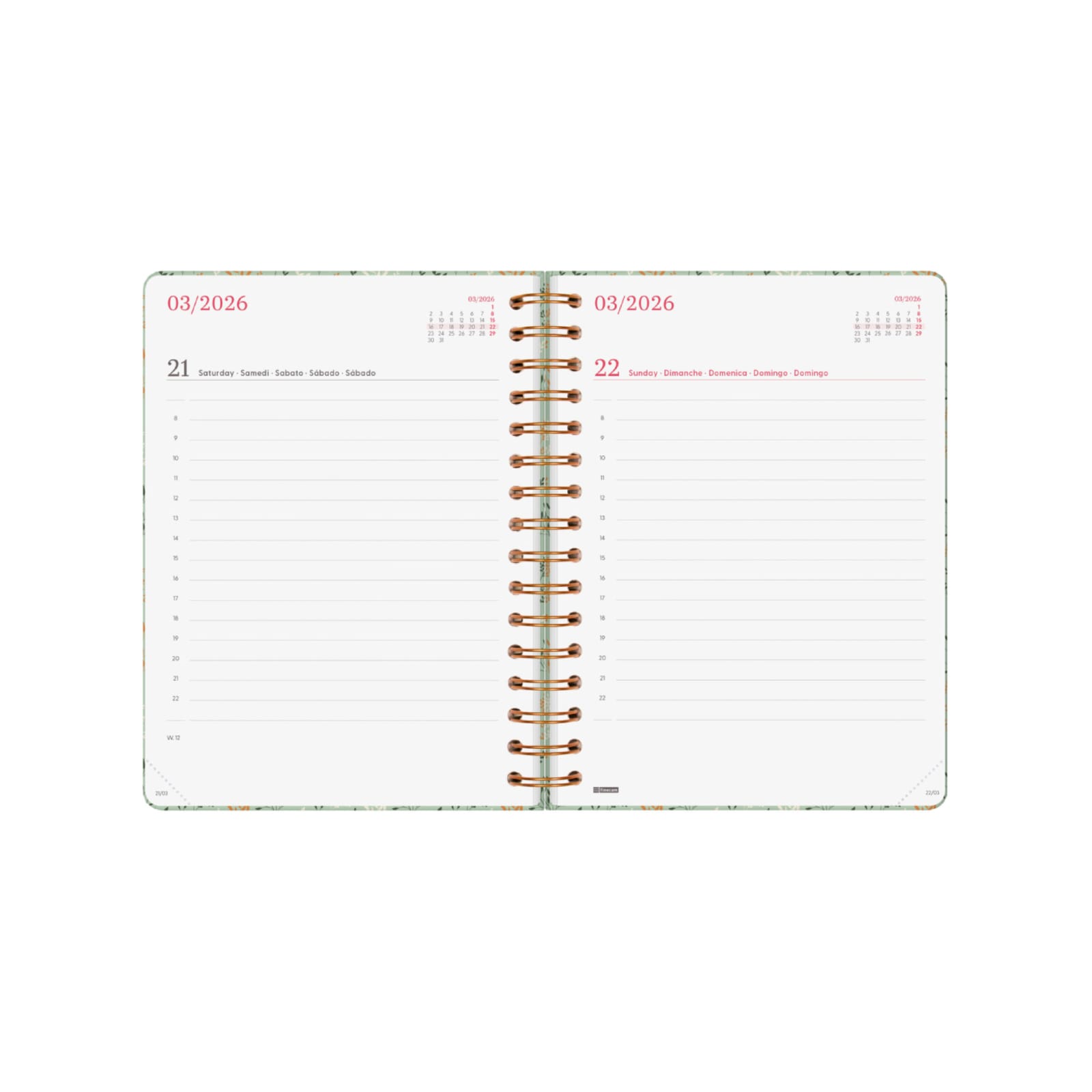 Amplo espaço para escrita para todos os dias. Com horas. Sábados e domingos em página inteira.