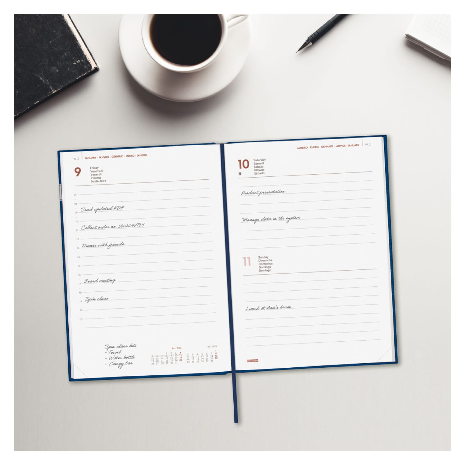 Agenda encadernada profissional de estilo moderno. Capa dura de papelão forrada com filme fosco anti-riscos. Abertura perfeita para digitação confortável. Com fita de malha e cantos microperfurados para localizar rapidamente o dia/semana atual. Ele contém informações de interesse na anuidade e outros conteúdos extras. Ideal para sua organização profissional e/ou pessoal.
