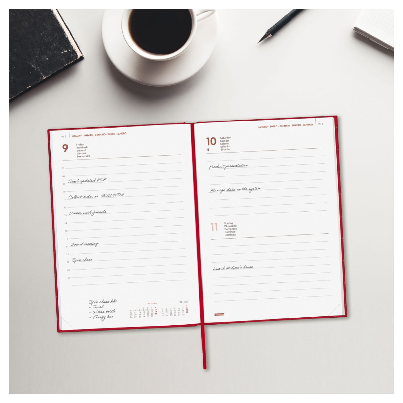 Agenda encadernada profissional de estilo moderno. Capa dura de papelão forrada com filme fosco anti-riscos. Abertura perfeita para digitação confortável. Com fita de malha e cantos microperfurados para localizar rapidamente o dia/semana atual. Ele contém informações de interesse na anuidade e outros conteúdos extras. Ideal para sua organização profissional e/ou pessoal.