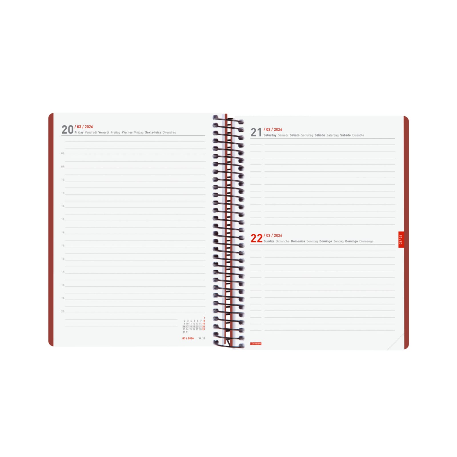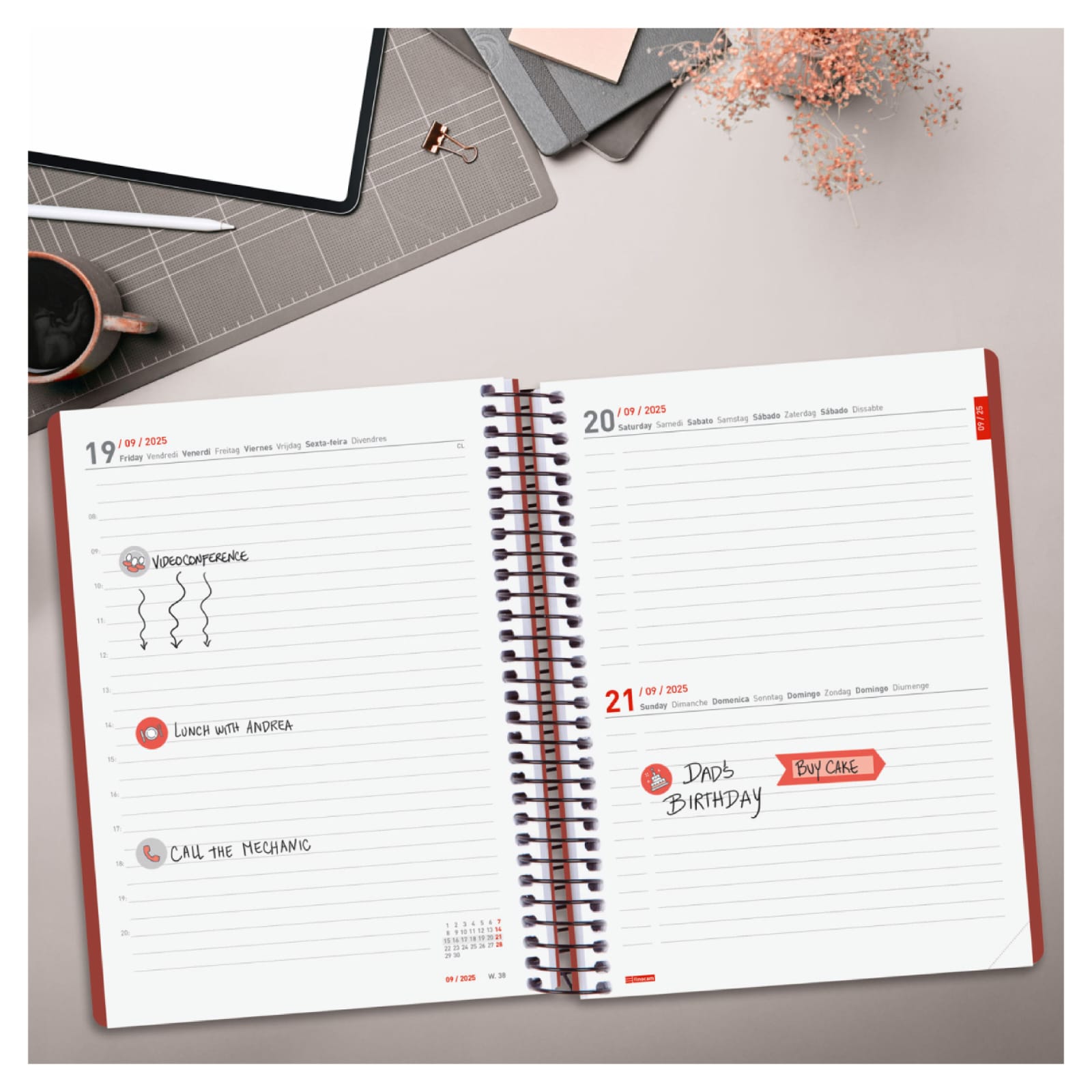 Agenda em espiral com capas leves feitas de polipropileno reciclado, de resíduos e poluição marinha. Ideal para avançar na organização do ano civil com 16 meses completos: início em setembro de 2025 e término em dezembro de 2026. Com elástico e cantos microperfurados para localizar rapidamente o dia/semana atual. Inclui adesivos temáticos voltados para a organização pessoal. Agenda com informações de interesse na anuidade e outros conteúdos extras.