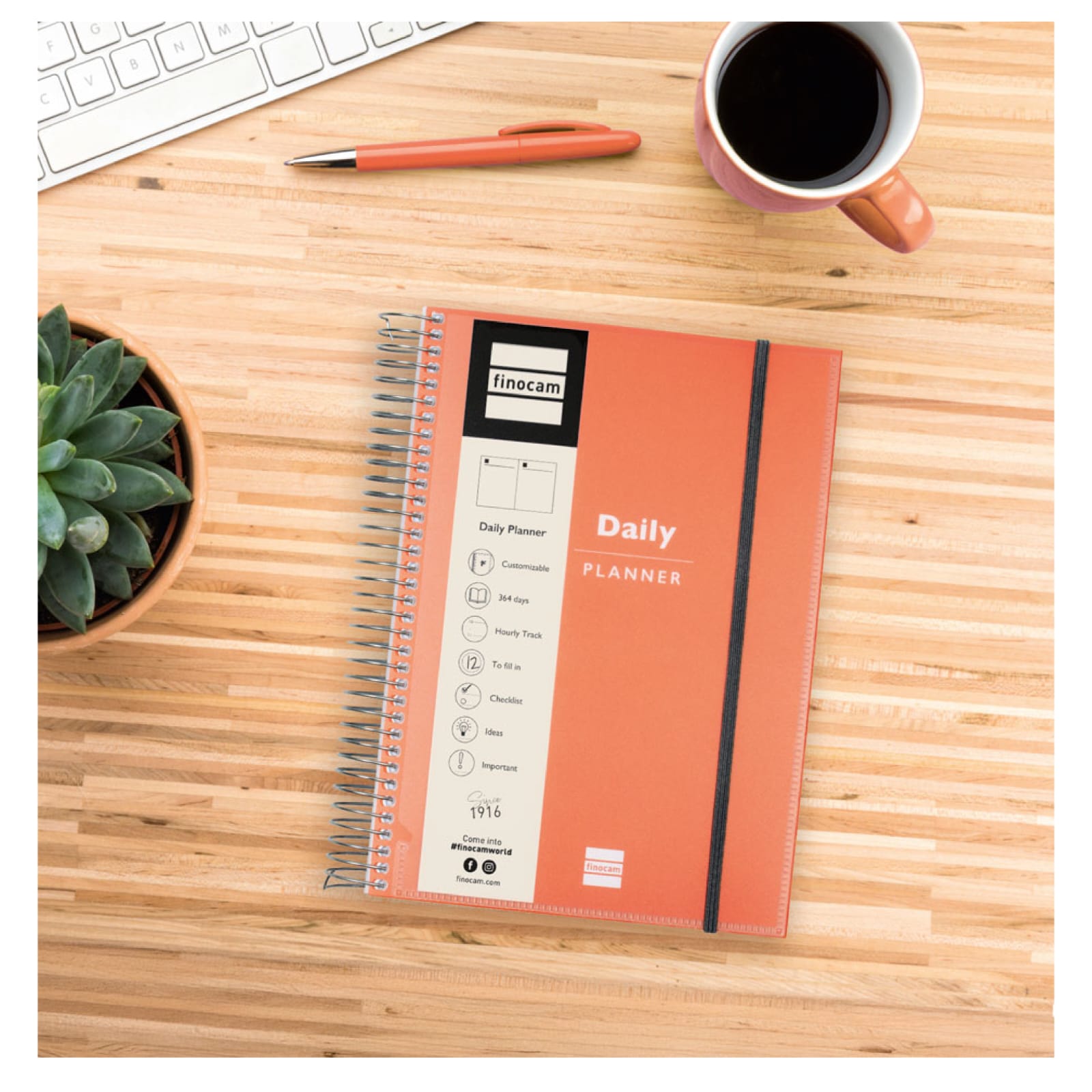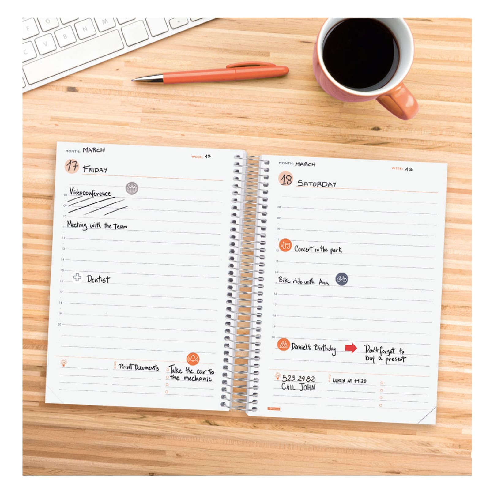 Agenda/Planejador espiral perpétuo para organizar quando quiser. Ideal para planejar períodos específicos do ano livremente. Com elástico. Com tampa de polipropileno leve que pode ser personalizada: crie e altere a capa da agenda ao seu gosto. Você pode inserir seu próprio desenho, fotografias, papéis que não pode perder, etc., ou também pode baixar a capa de sua escolha na seção Downloads do site da Finocam. Equipado com adesivos temáticos voltados para a organização pessoal. Cantos microperfurados para localizar rapidamente o dia/semana atual. O design de interiores é limpo e fácil, com espaço suficiente para organizar seus projetos, tarefas e compromissos.