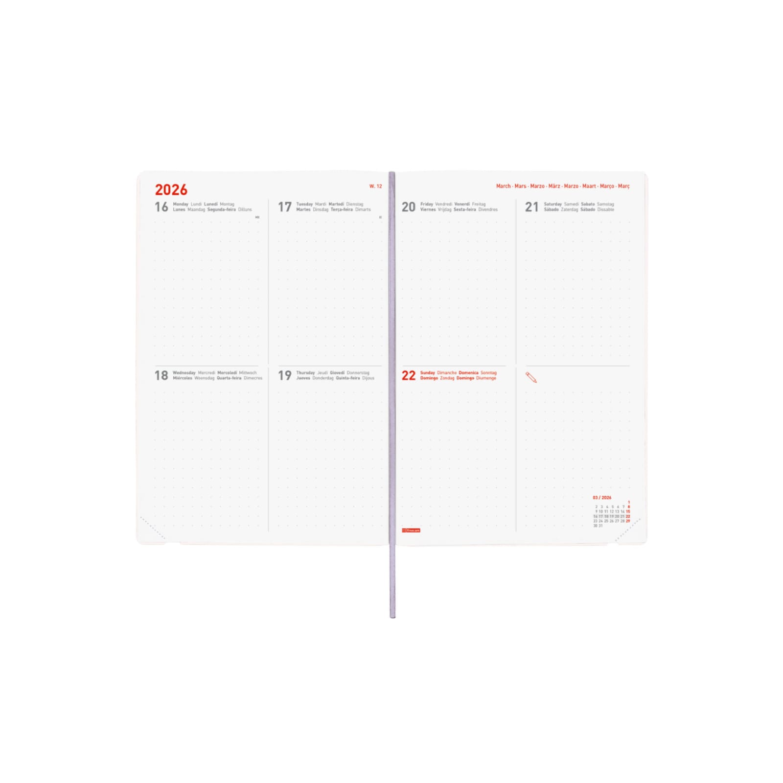 Agenda flexível com capa de 16 meses completos: início em setembro de 2025 e término em dezembro de 2026. Perfeito para planejamento de longo prazo. Capas flexíveis muito agradáveis ao toque e abertura perfeita para uma digitação confortável. Com fita de malha e elástico. O design de interiores é pontilhado para uma escrita mais livre horizontalmente, verticalmente ou para "letras" ou desenhos, e oferece espaço suficiente para guiar sua vida diária e semanal. Os cantos são microperfurados para localizar rapidamente a semana atual. Agenda com informações de interesse na anuidade e outros conteúdos extras.