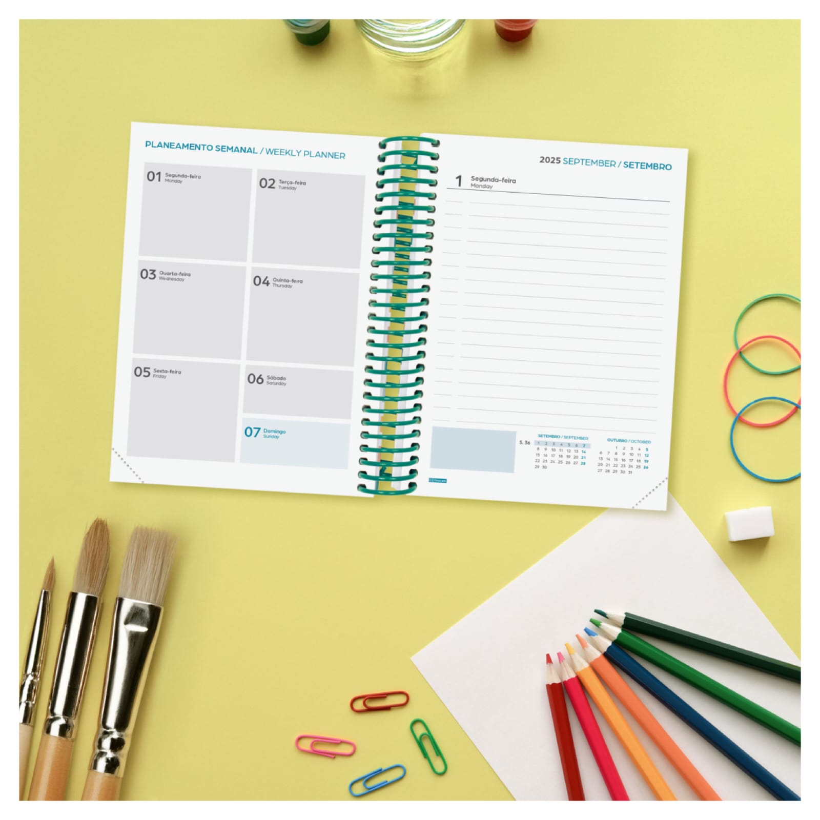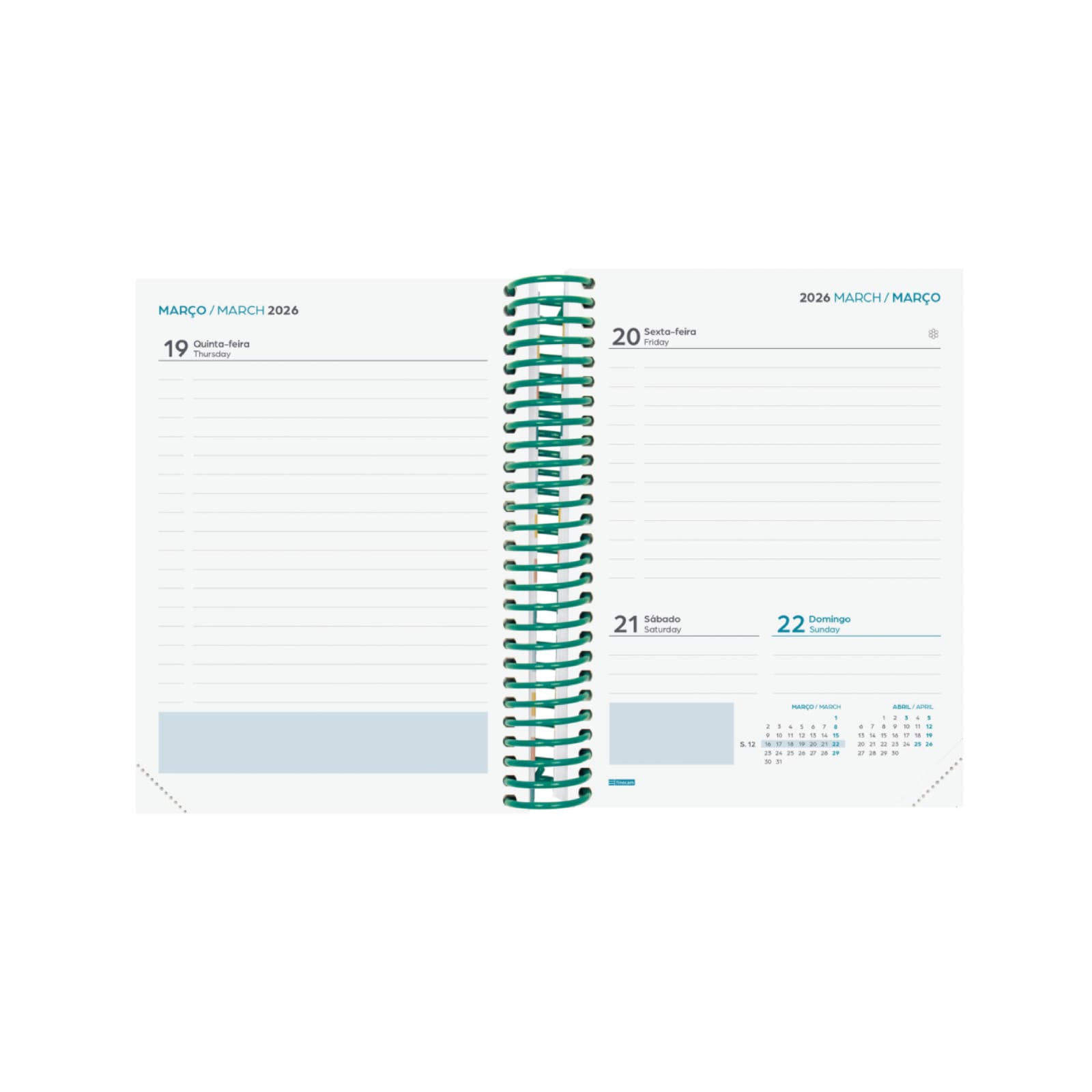 Agenda para alunos que visam a organização do ano letivo. Espiral de plástico e capa de cartão forrado. Os cantos são microperfurados para localizar rapidamente o dia/semana atual. Agenda com informações de interesse na anuidade e outros conteúdos extras úteis e práticos.
