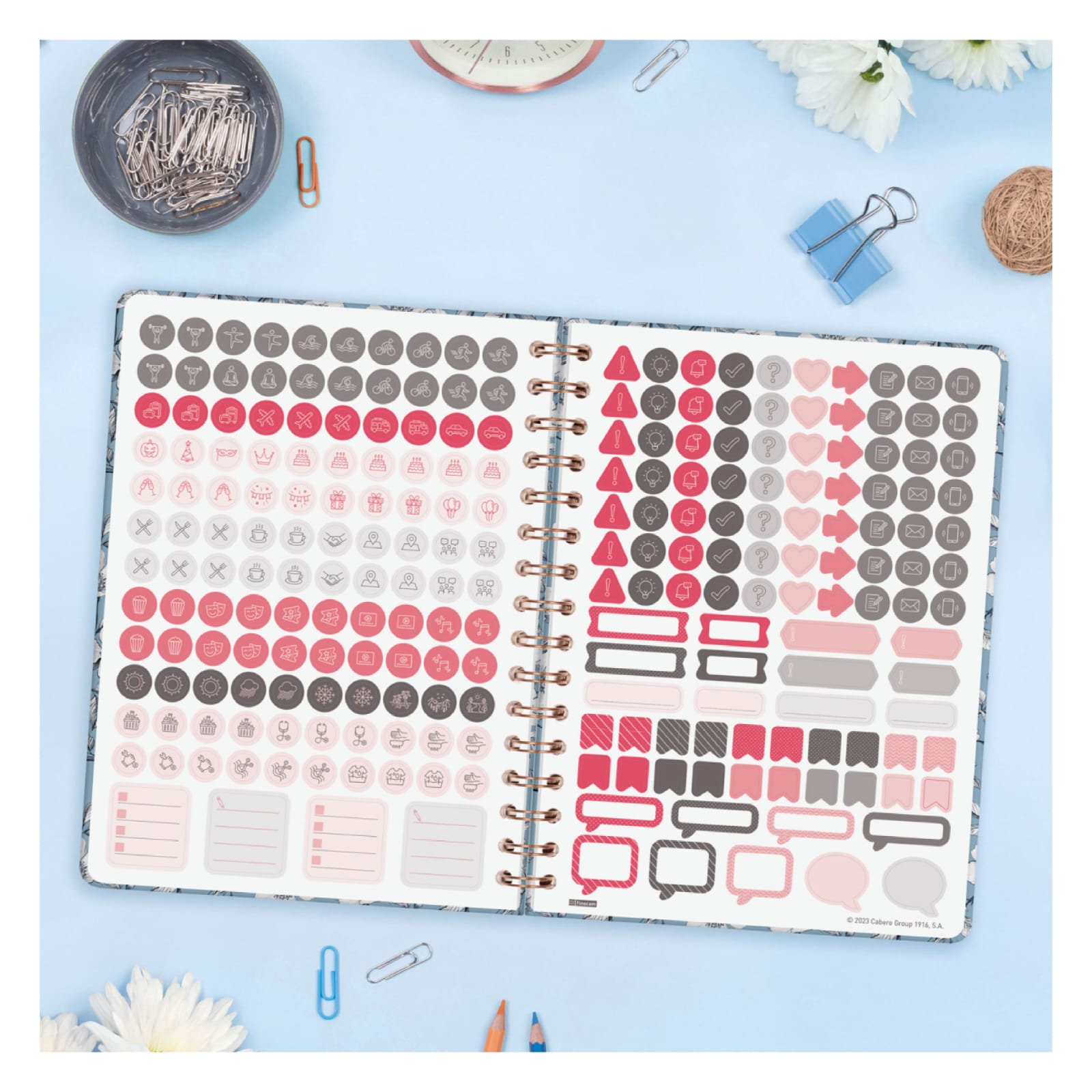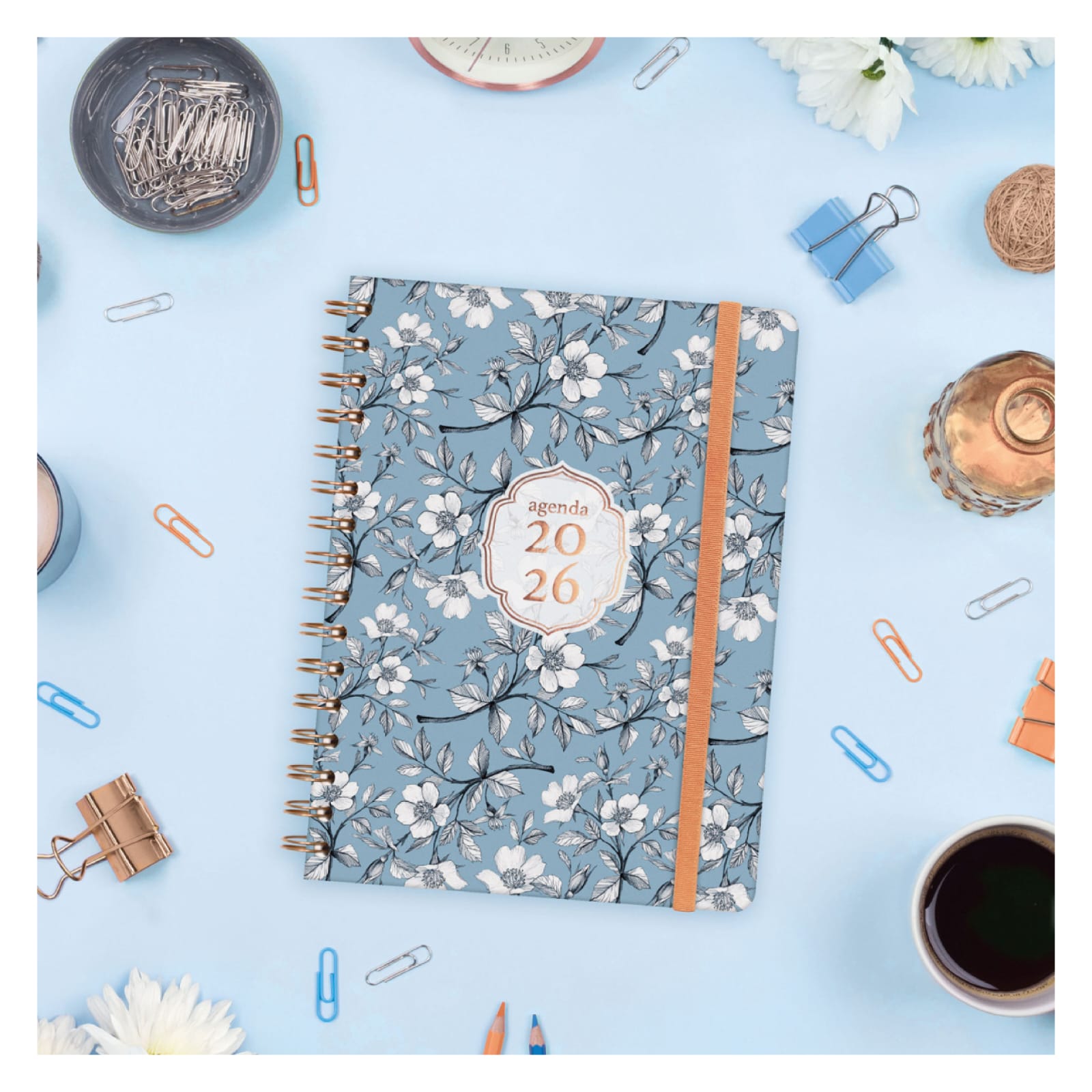 Agenda espiral com capa dura feita de papelão forrada com filme fosco resistente a arranhões. Design elegante e moderno com detalhes impressos metálicos. Ideal para uso pessoal e/ou profissional. Com elástico e cantos microperfurados para localizar rapidamente o dia/semana atual. O design de interiores é limpo e fácil, com espaço suficiente para organizar seus projetos, tarefas e compromissos. Contém informações de interesse na anuidade e outros extras para organização pessoal. Além disso, inclui um conjunto de adesivos temáticos.