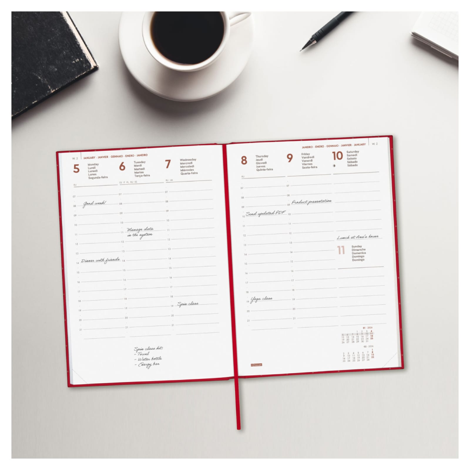 Agenda encadernada profissional de estilo moderno. Capa dura de papelão forrada com filme fosco anti-riscos. Abertura perfeita para digitação confortável. Com fita de malha e cantos microperfurados para localizar rapidamente o dia/semana atual. Ele contém informações de interesse na anuidade e outros conteúdos extras. Ideal para sua organização profissional e/ou pessoal.