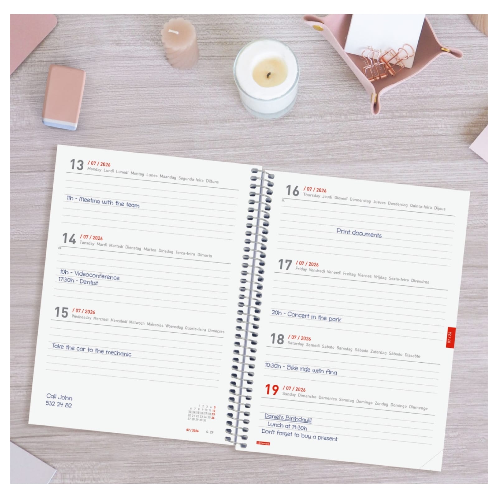 Agenda espiral de 18 meses: começa em julho de 2025 e termina em dezembro de 2026. Perfeito para planejamento de longo prazo. Fecho com elástico. Os cantos são microperfurados para poder localizar rapidamente o dia/semana atual. Para facilitar a localização a cada mês, a anuidade oferece um indicador no lado direito das páginas. Agenda com informações de interesse na anuidade e outros conteúdos extras.