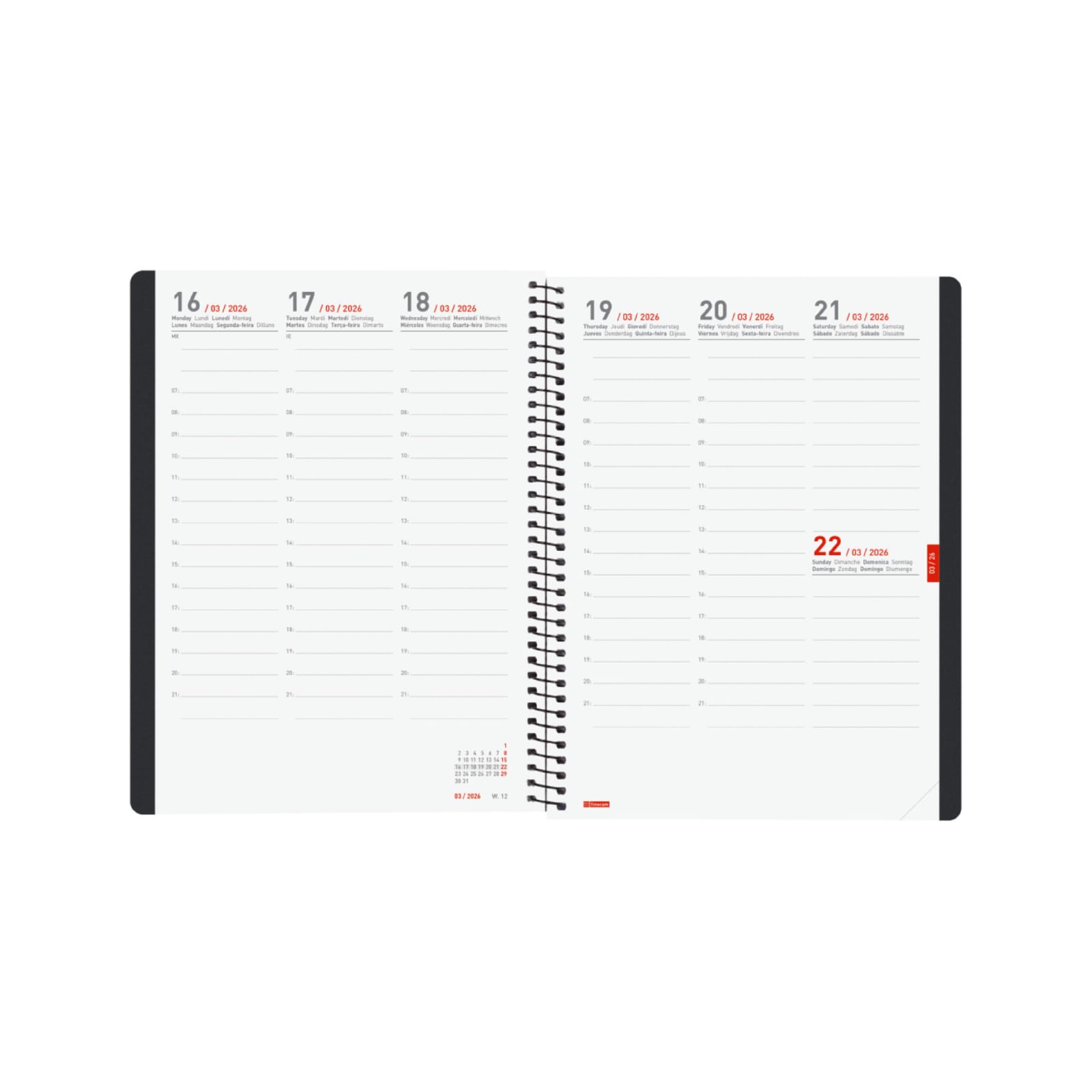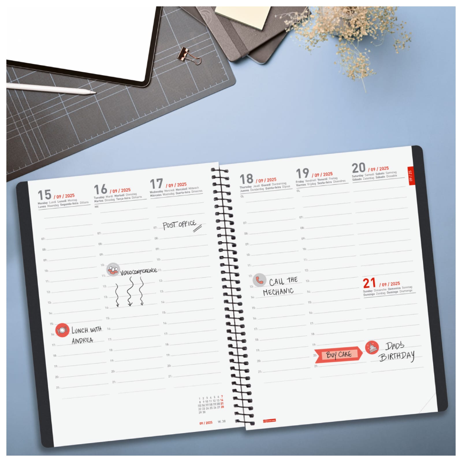 Agenda em espiral com capas leves feitas de polipropileno reciclado, de resíduos e poluição marinha. Ideal para avançar na organização do ano civil com 16 meses completos: início em setembro de 2025 e término em dezembro de 2026. Com elástico e cantos microperfurados para localizar rapidamente o dia/semana atual. Inclui adesivos temáticos voltados para a organização pessoal. Agenda com informações de interesse na anuidade e outros conteúdos extras.