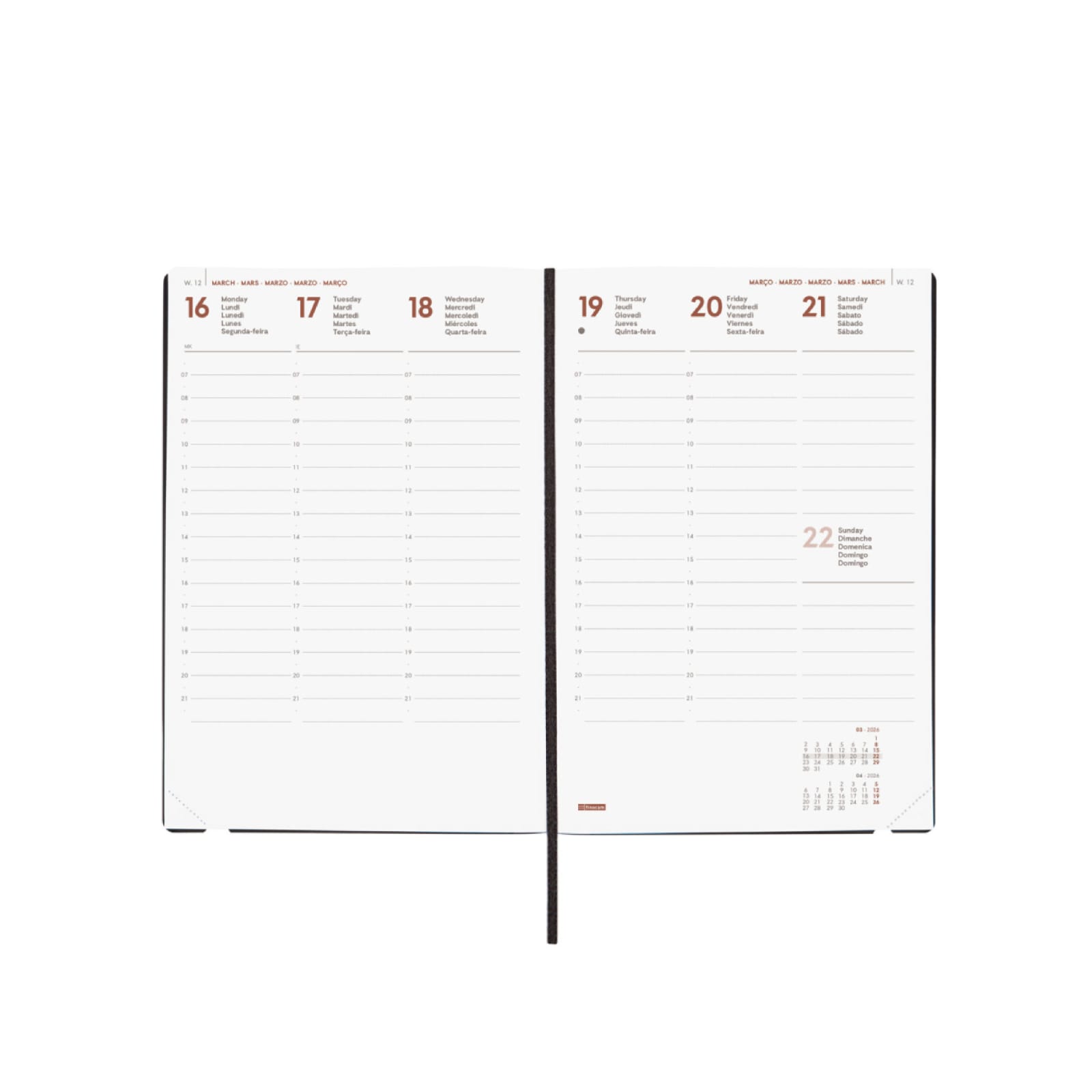 Agenda de capa mole encadernada profissional. Toque macio muito agradável. Estilo moderno e universal. Abertura perfeita para digitação confortável. Com elástico, fita de malha e cantos microperfurados para localizar rapidamente o dia/semana atual. Ele contém informações de interesse na anuidade e outros conteúdos extras.