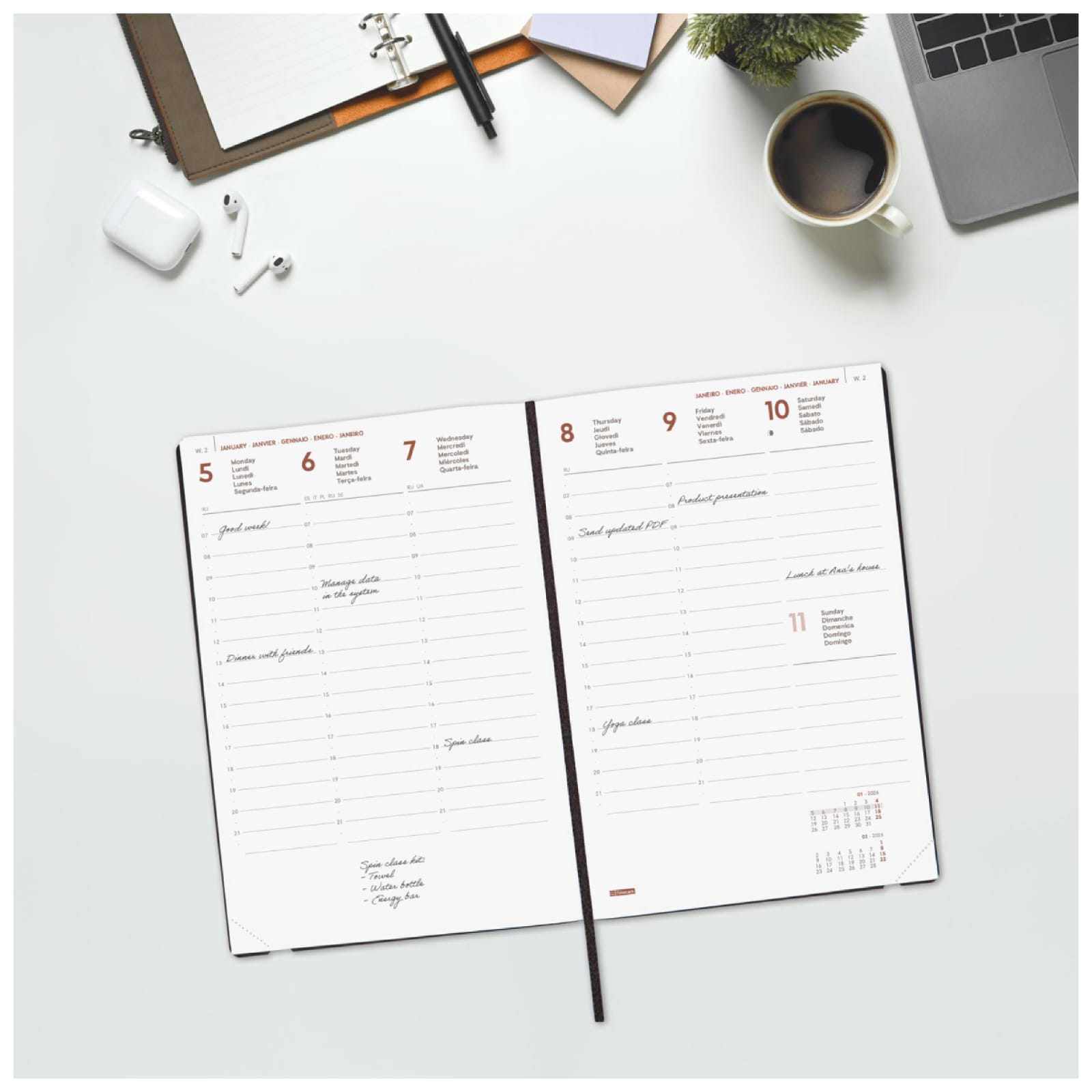 Agenda de capa mole encadernada profissional. Toque macio muito agradável. Estilo moderno e universal. Abertura perfeita para digitação confortável. Com elástico, fita de malha e cantos microperfurados para localizar rapidamente o dia/semana atual. Ele contém informações de interesse na anuidade e outros conteúdos extras.
