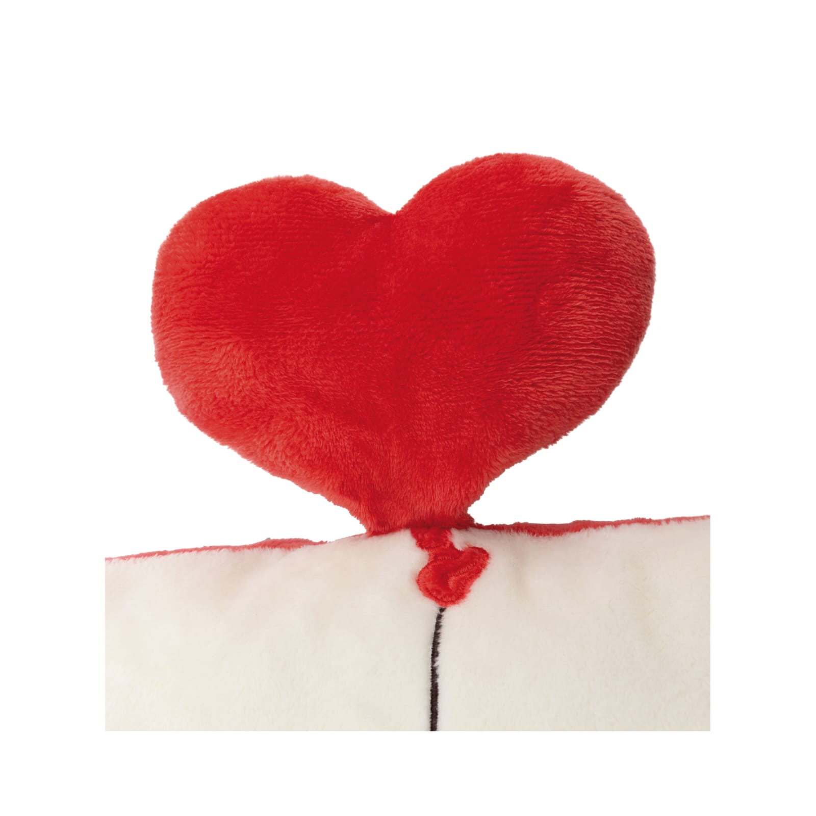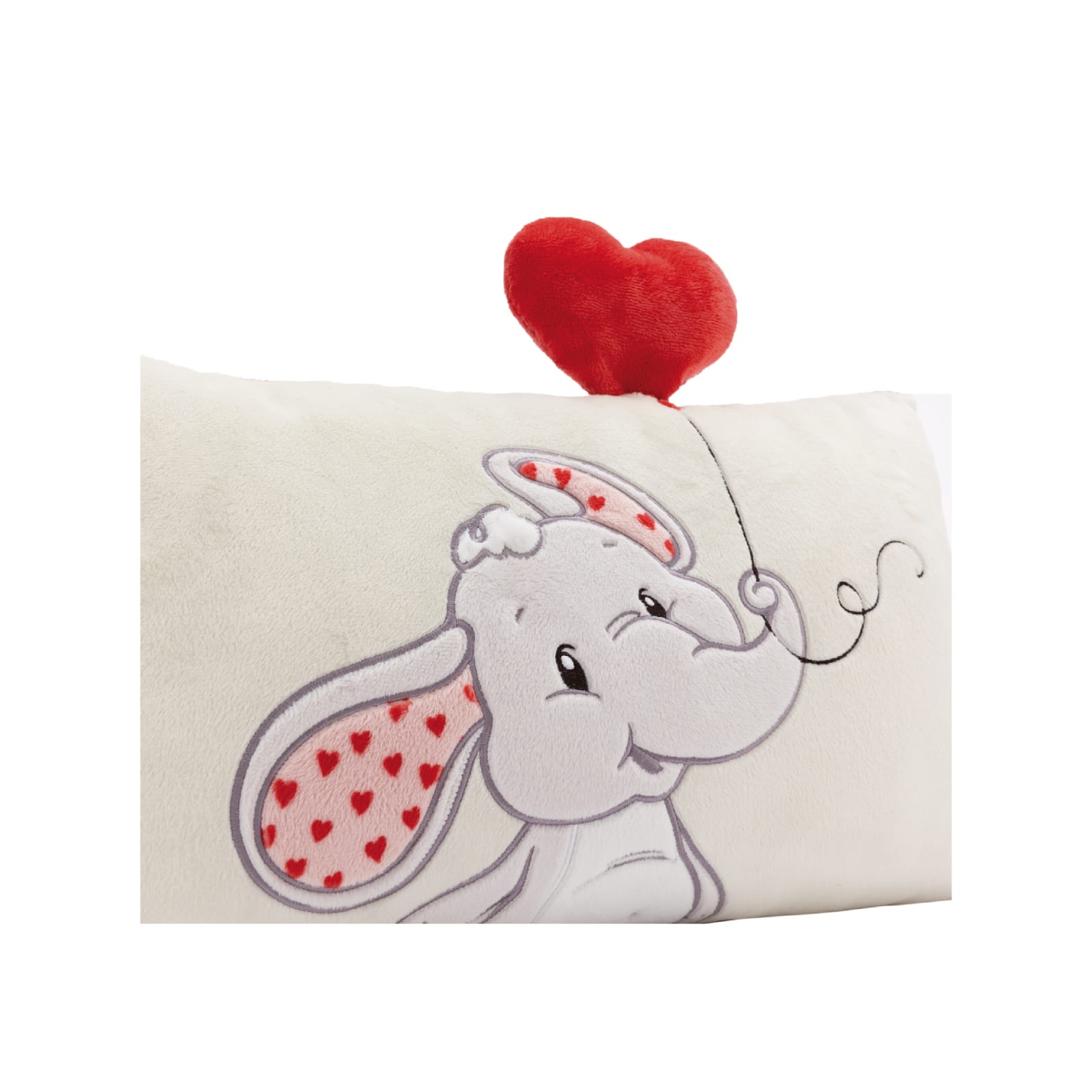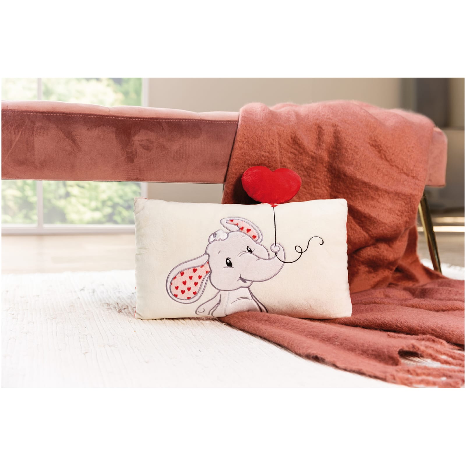 A almofada retangular de pelúcia da coleção Love Classic da NICI é bordada com o adorável Love Elephant segurando um balão de coração vermelho (elemento de pelúcia 3D) com sua tromba.