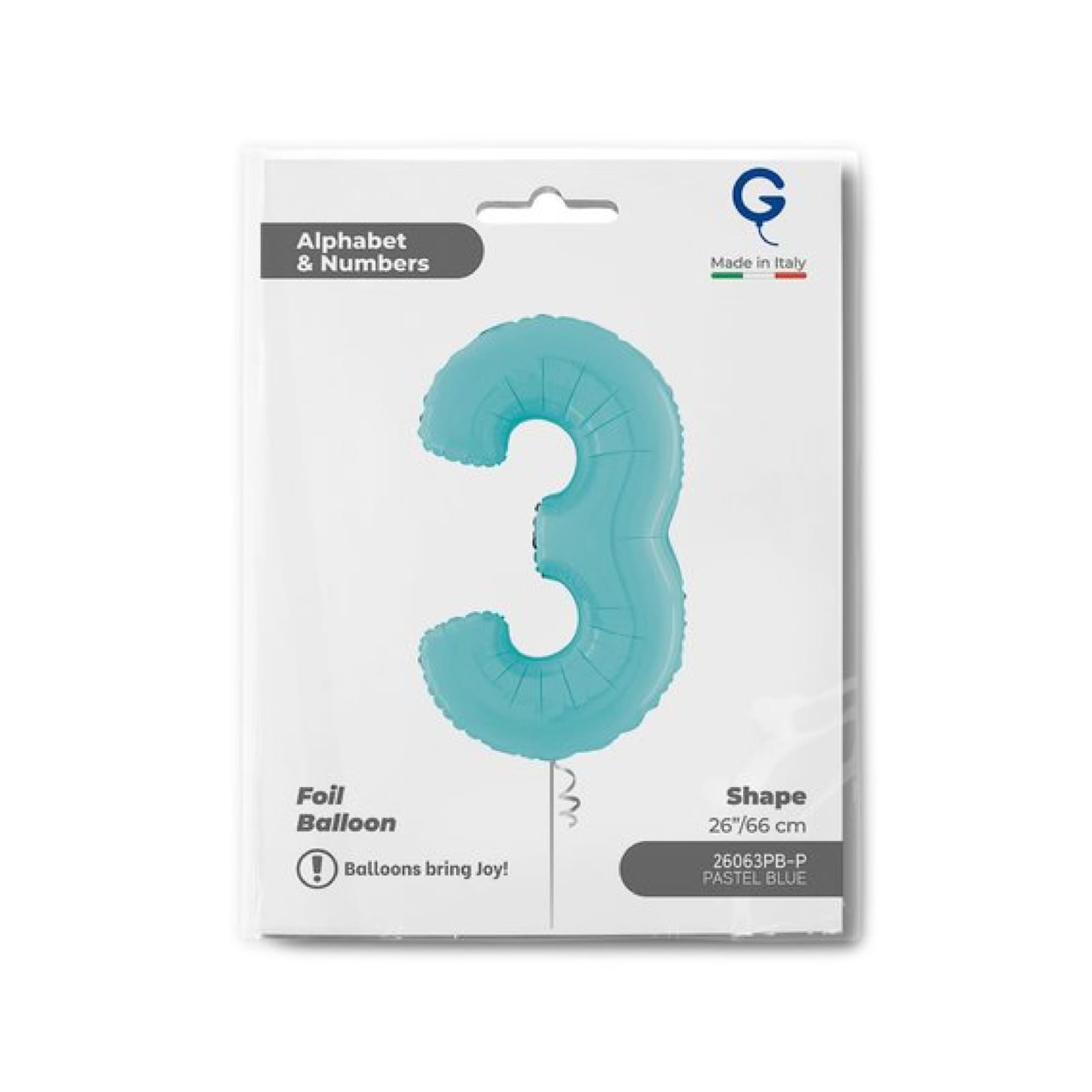 Destaque a sua decoração com o elegante balão foil número 3 em azul pastel. Com 66 cm (26”), é perfeito para aniversários, datas comemorativas e eventos especiais.
