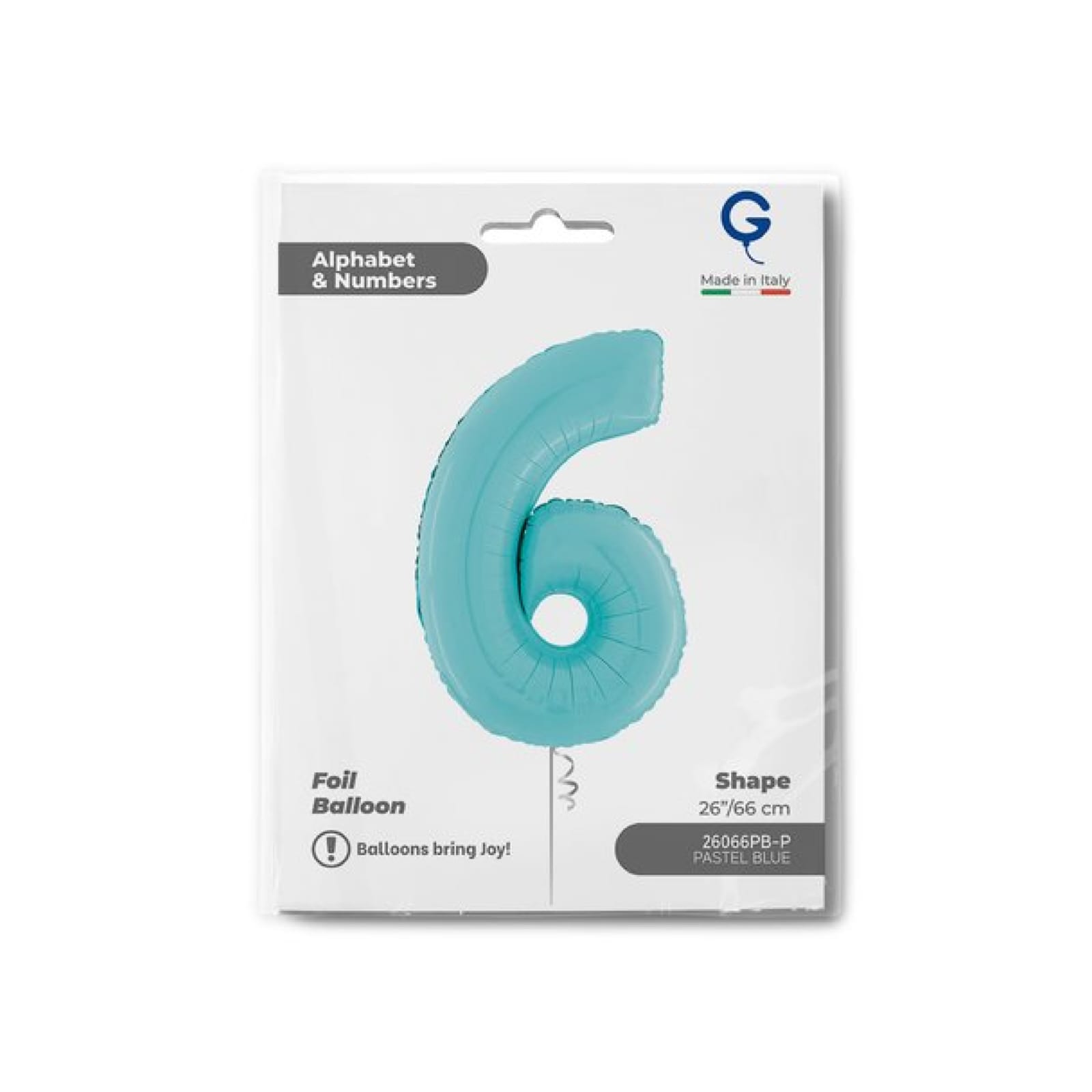 Destaque a sua decoração com o elegante balão foil número 6 em azul pastel. Com 66 cm (26”), é perfeito para aniversários, datas comemorativas e eventos especiais.