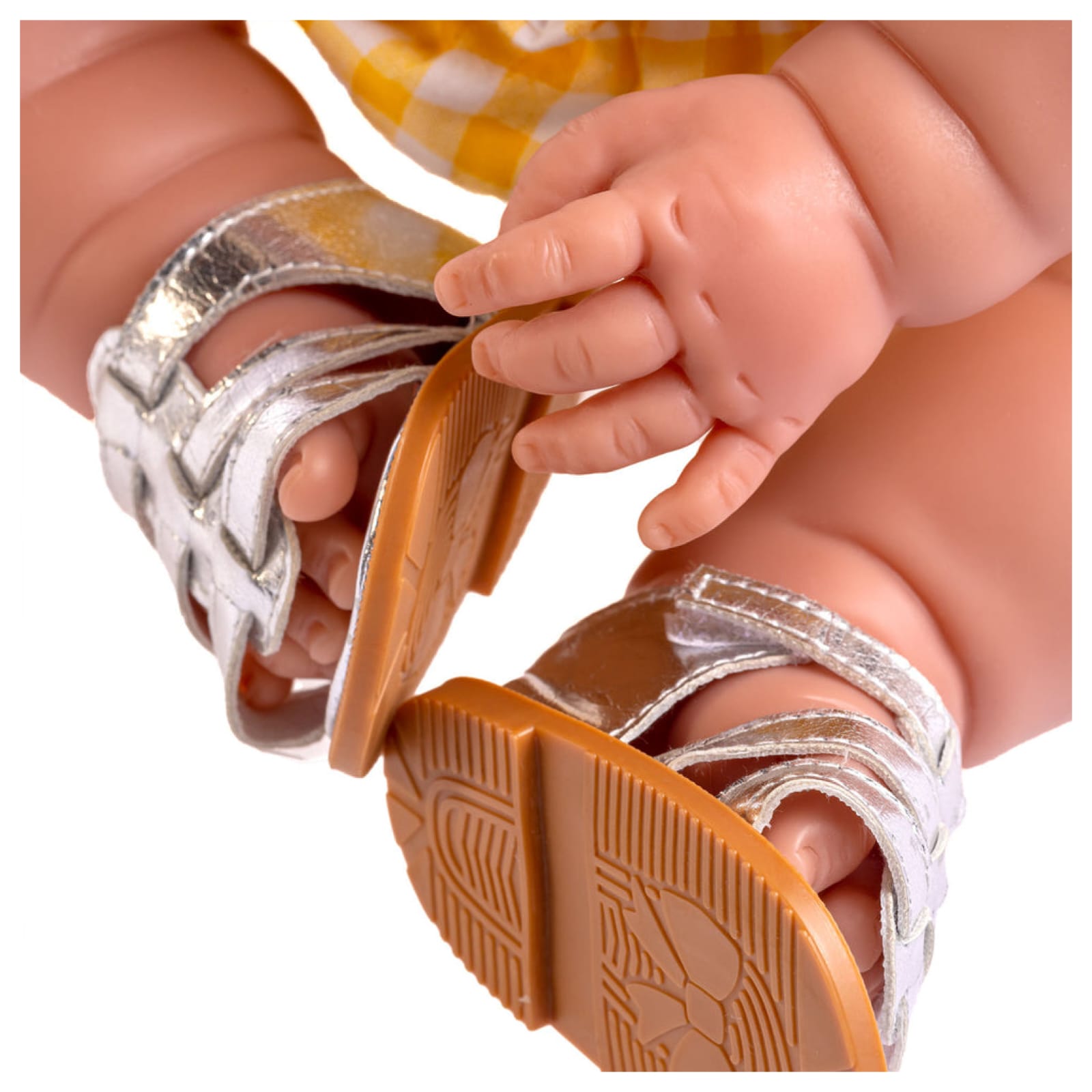 Este conjunto completo inclui uma boneca de 36 cm, vestida com um alegre conjunto de verão de 3 peças — top curto com folhos e padrão aos quadrados, cuequinha a condizer e chapéu — complementado por sandálias prateadas cheias de estilo.