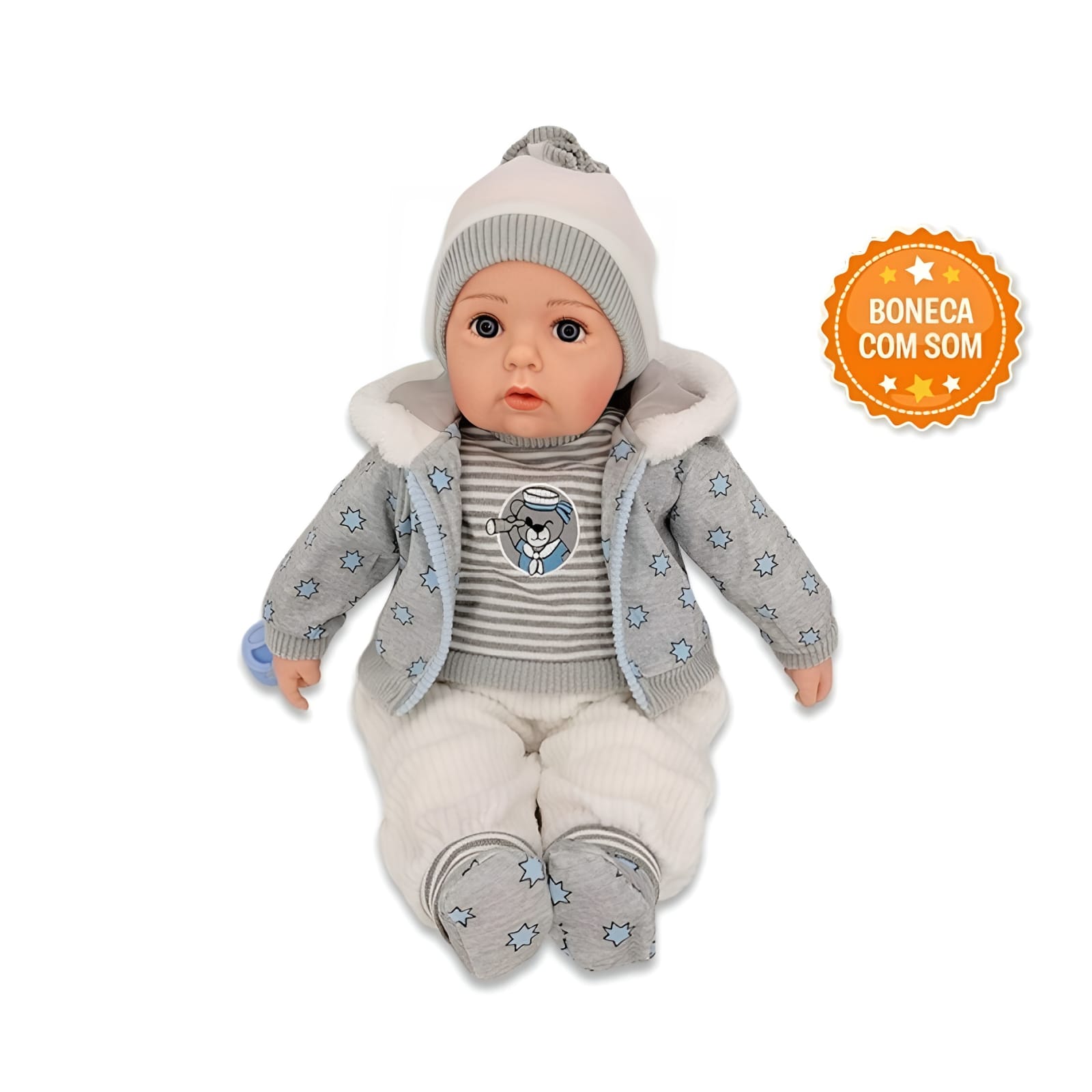 Boneco Bebé com Casaco Cinza/Azul 50 cm (com Som)