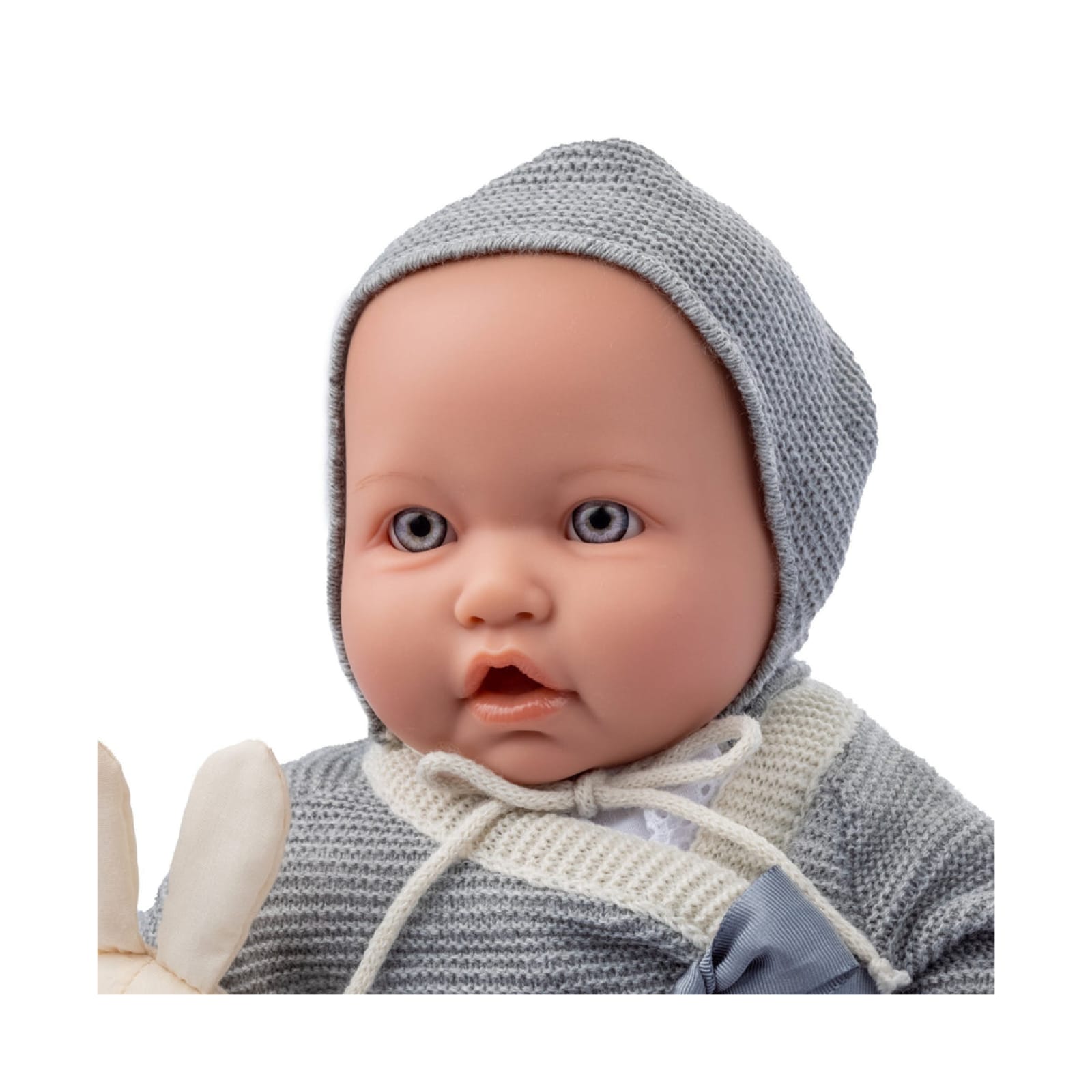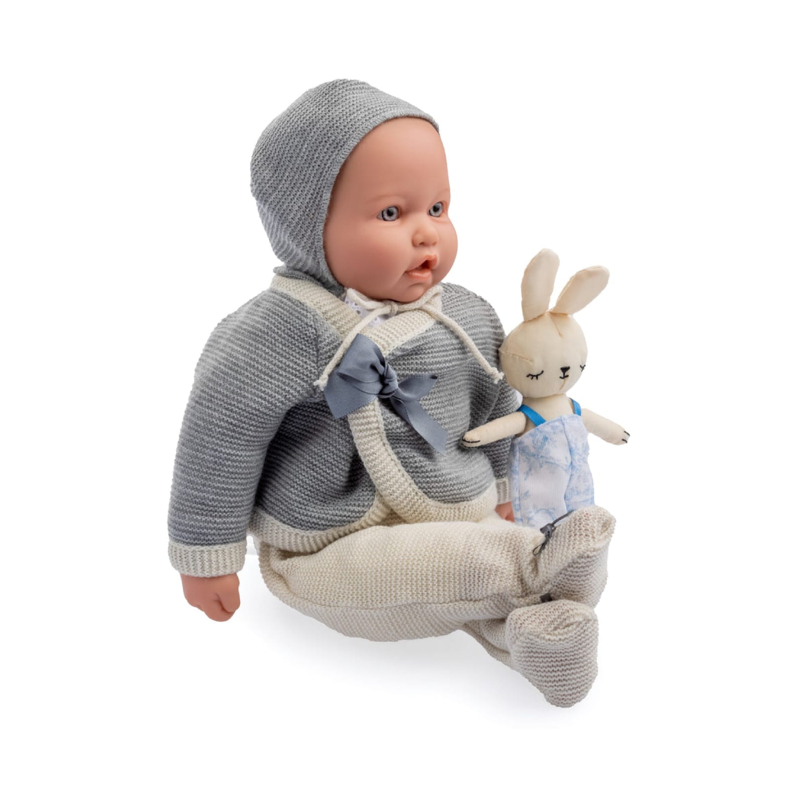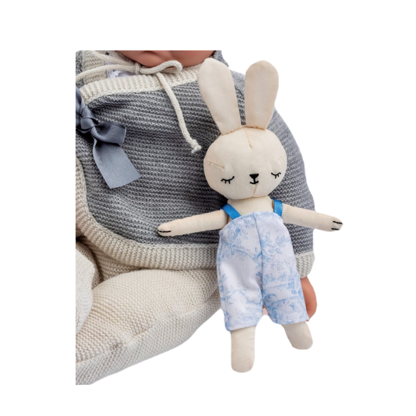 Este conjunto de presente inclui um boneco de 43 cm, vestido com uma elegante roupa de tricô em tons de cinza e bege, acompanhada do seu adorável coelhinho de pelúcia.