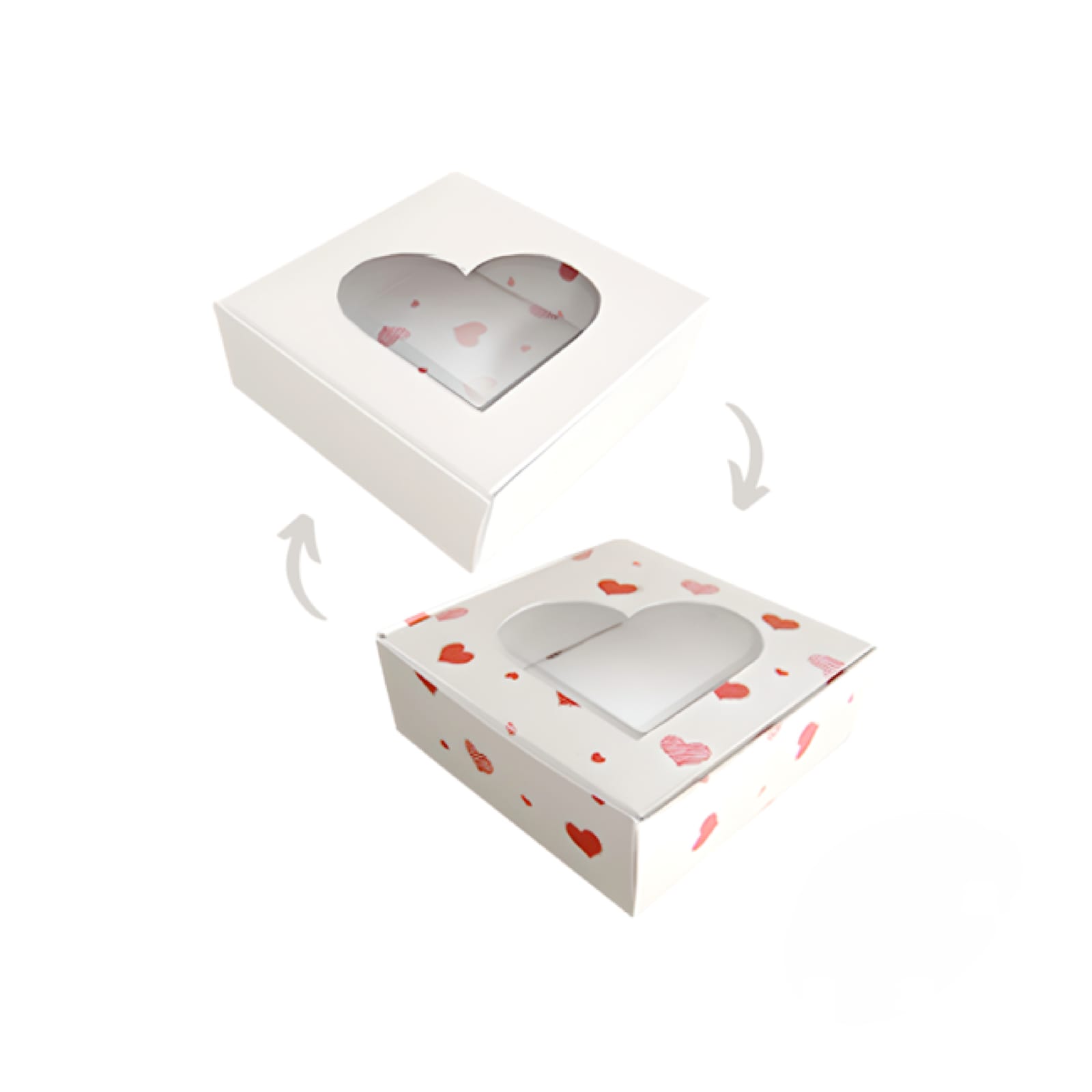 Caixa em cartolina reversível, com padrão de corações vermelhos de um lado e branca do outro, permitindo escolher o estilo de apresentação conforme a ocasião.
