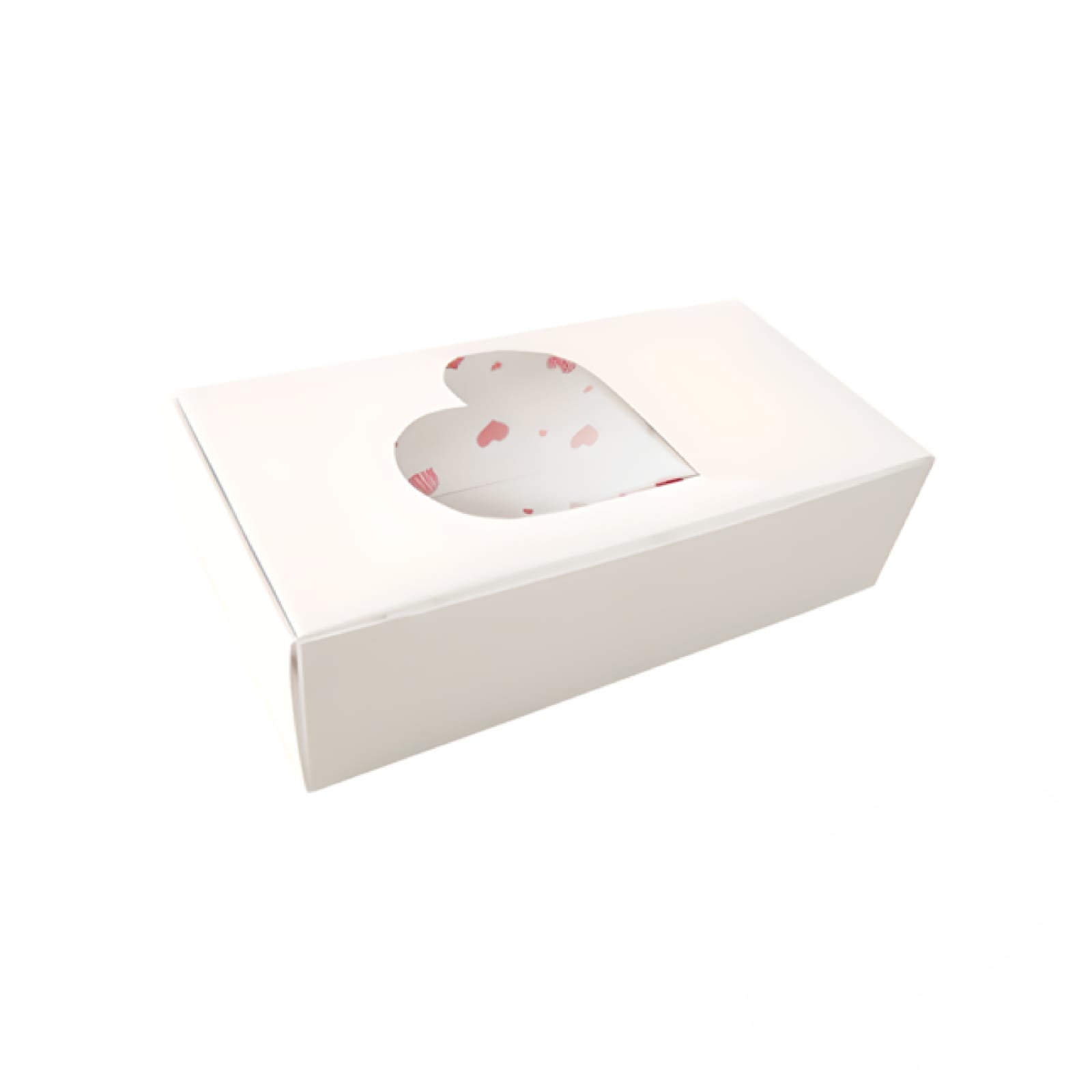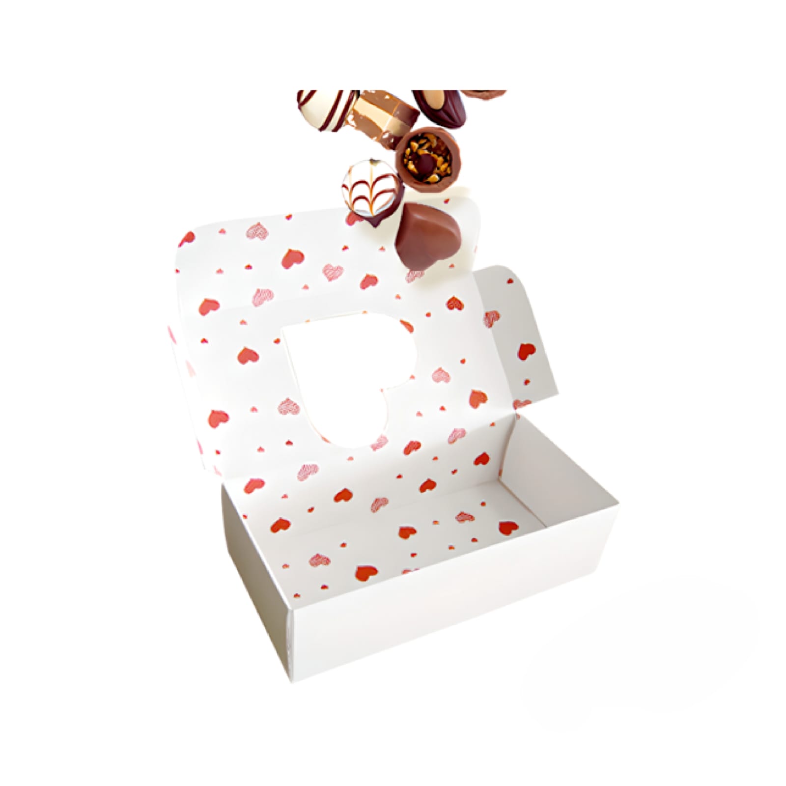Caixa em cartolina reversível, com padrão de corações vermelhos de um lado e branca do outro, permitindo escolher o estilo de apresentação conforme a ocasião.