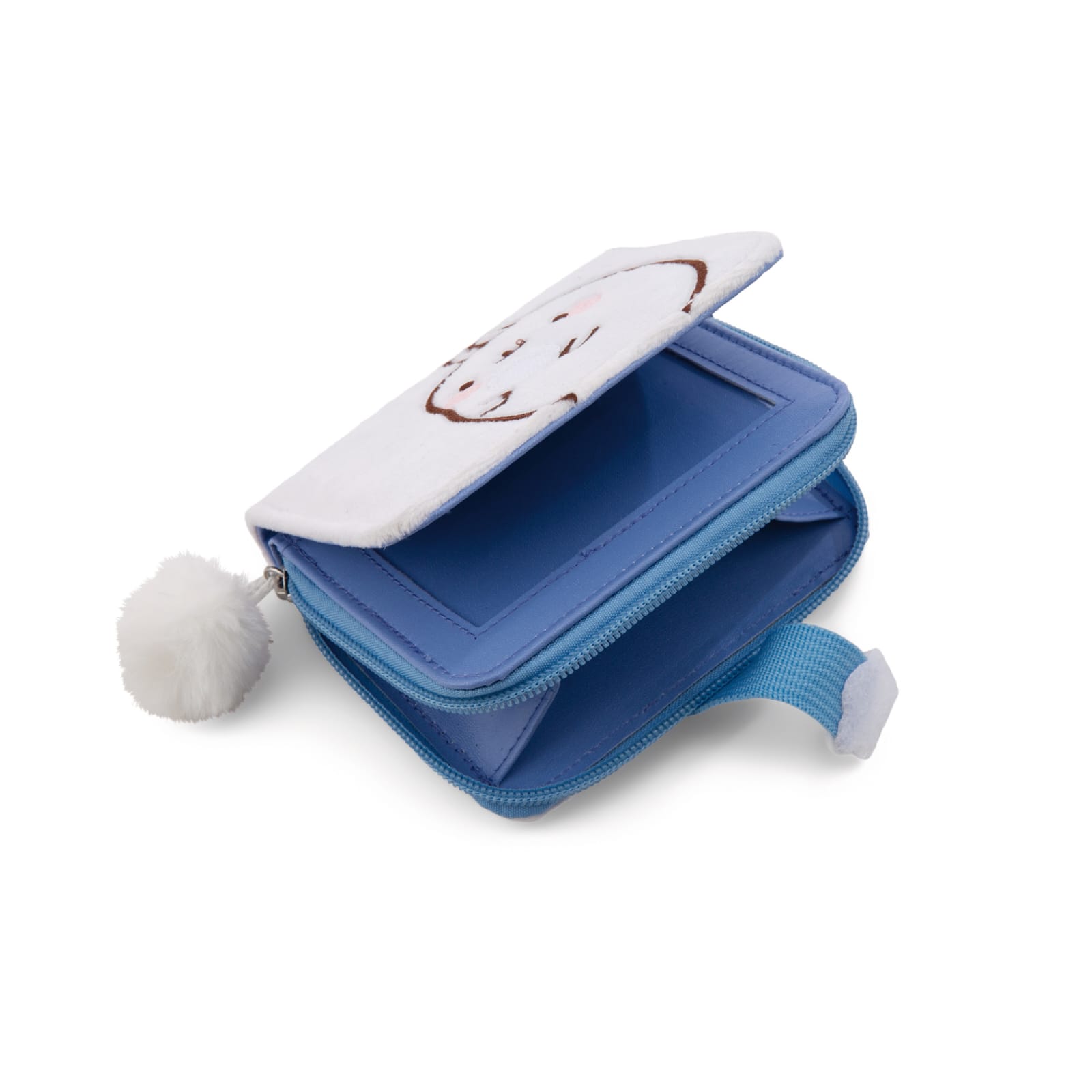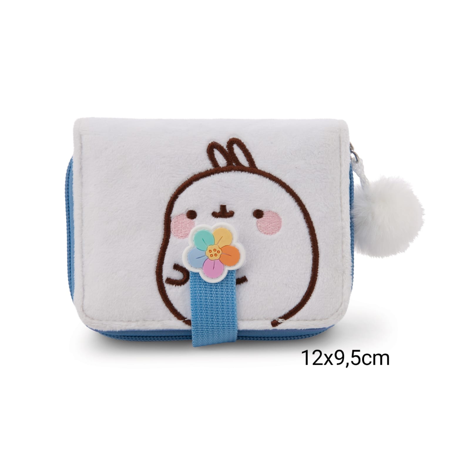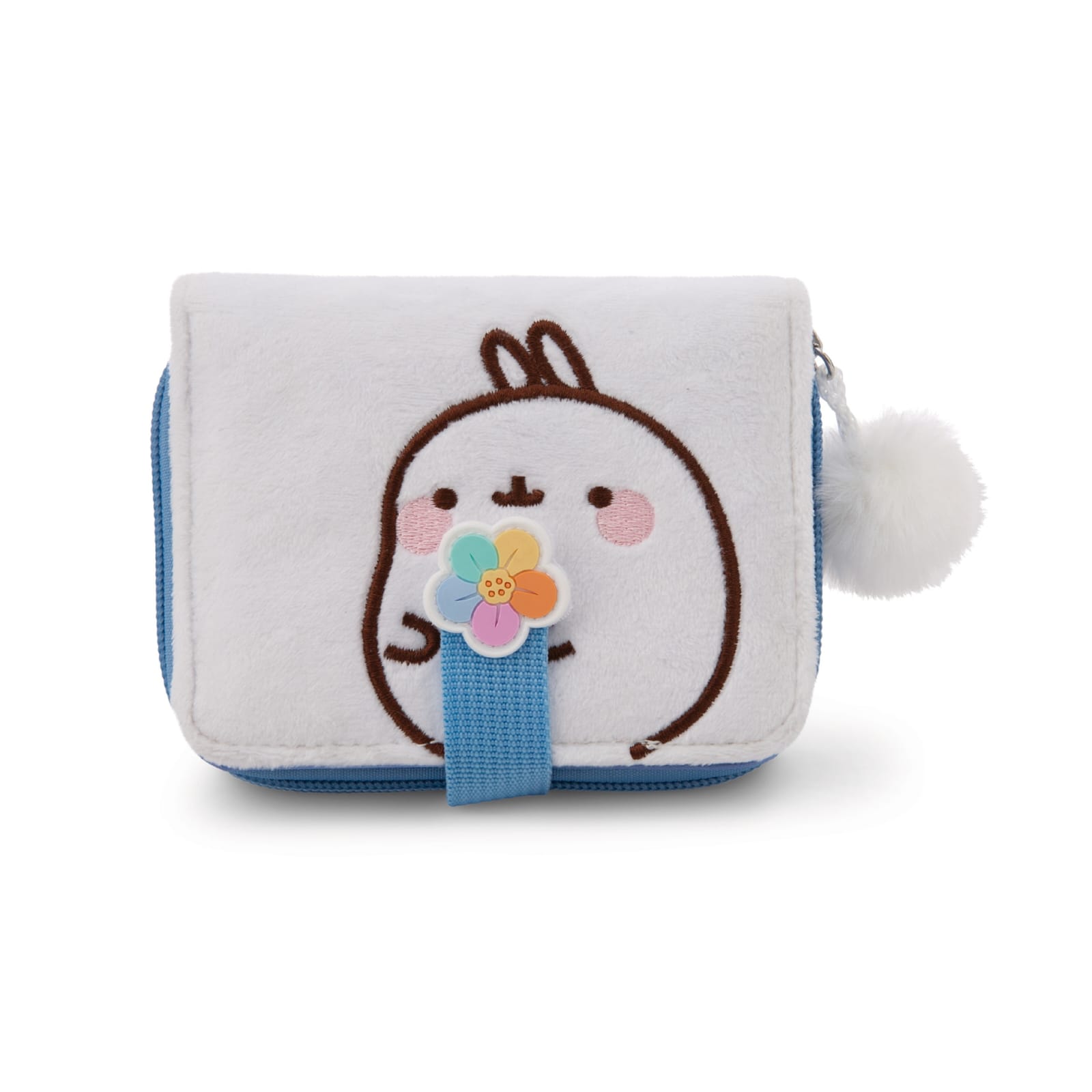 A carteira branca mostra Molang, o adorável personagem da série de TV de mesmo nome e conhecido nas redes sociais, na frente e o logotipo da MOLANG nas costas.