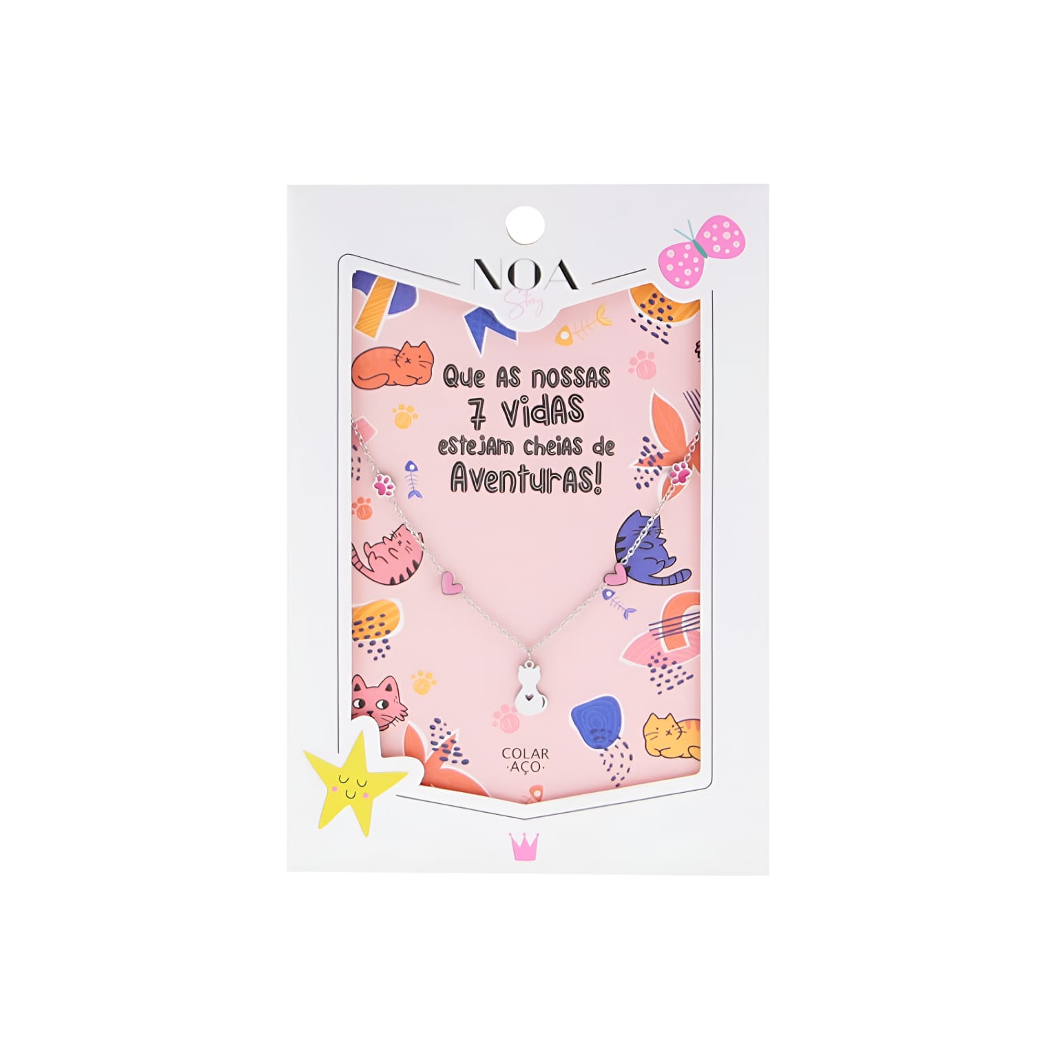 Colar Prateado em Aço "Que as nossas 7 vidas estejam cheias de aventuras!" | Noa Story Kids 🐱✨💖