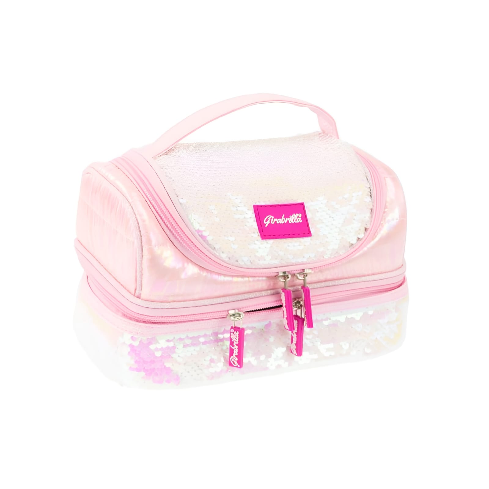 Lancheira bonita e compacta coberta com tecido iridescente macio e acabamentos reversíveis de lantejoulas Girabrilla.