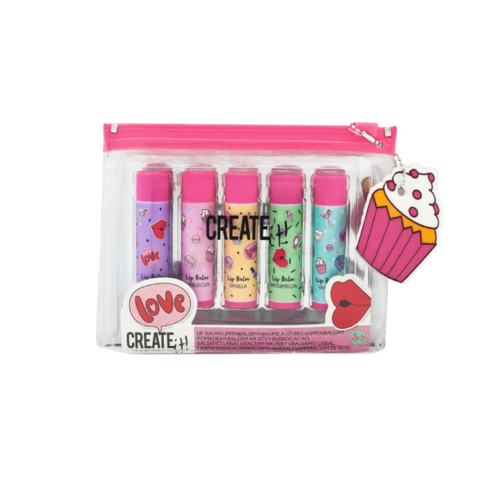 O conjunto é composto por cinco bálsamos labiais diferentes: