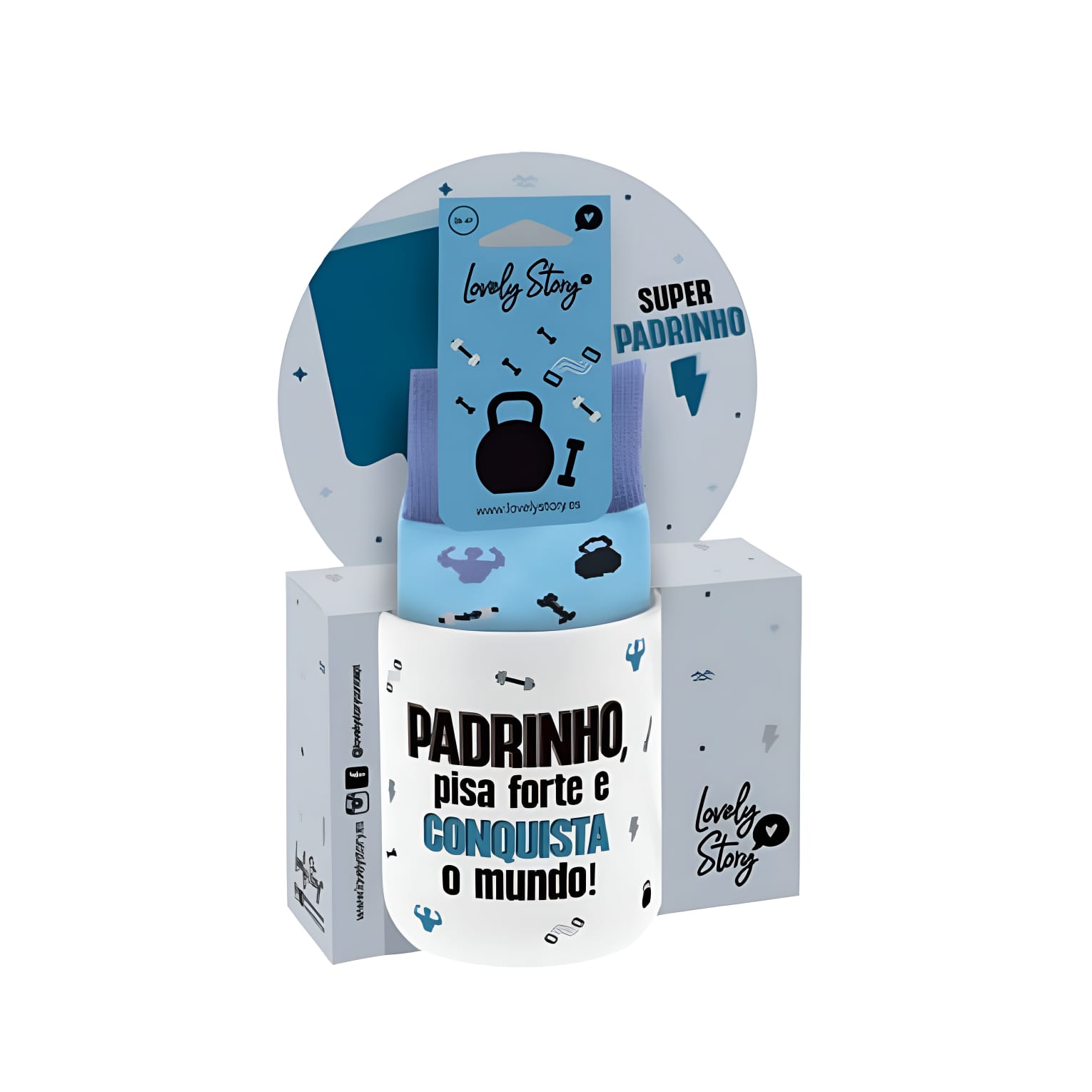 Conjunto Caneca + Meias “Padrinho, Pisa Forte e Conquista o Mundo!” | Lovely Story