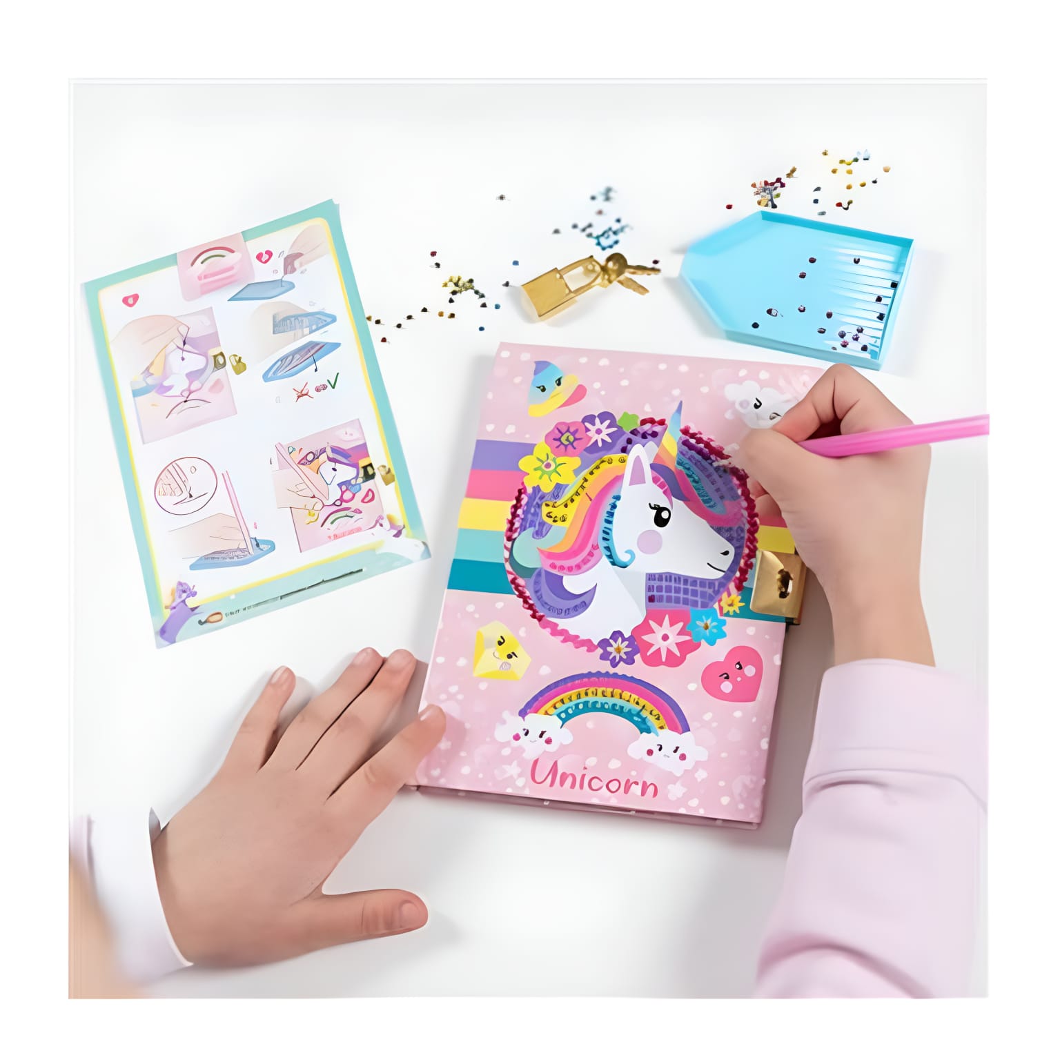 Torna cada dia mais mágico com o Diário Unicórnio Pinta com Diamantes! Perfeito para quem adora brilho e fantasia, este diário encantador permite personalizar a capa com pequenos diamantes coloridos, criando um efeito deslumbrante.
