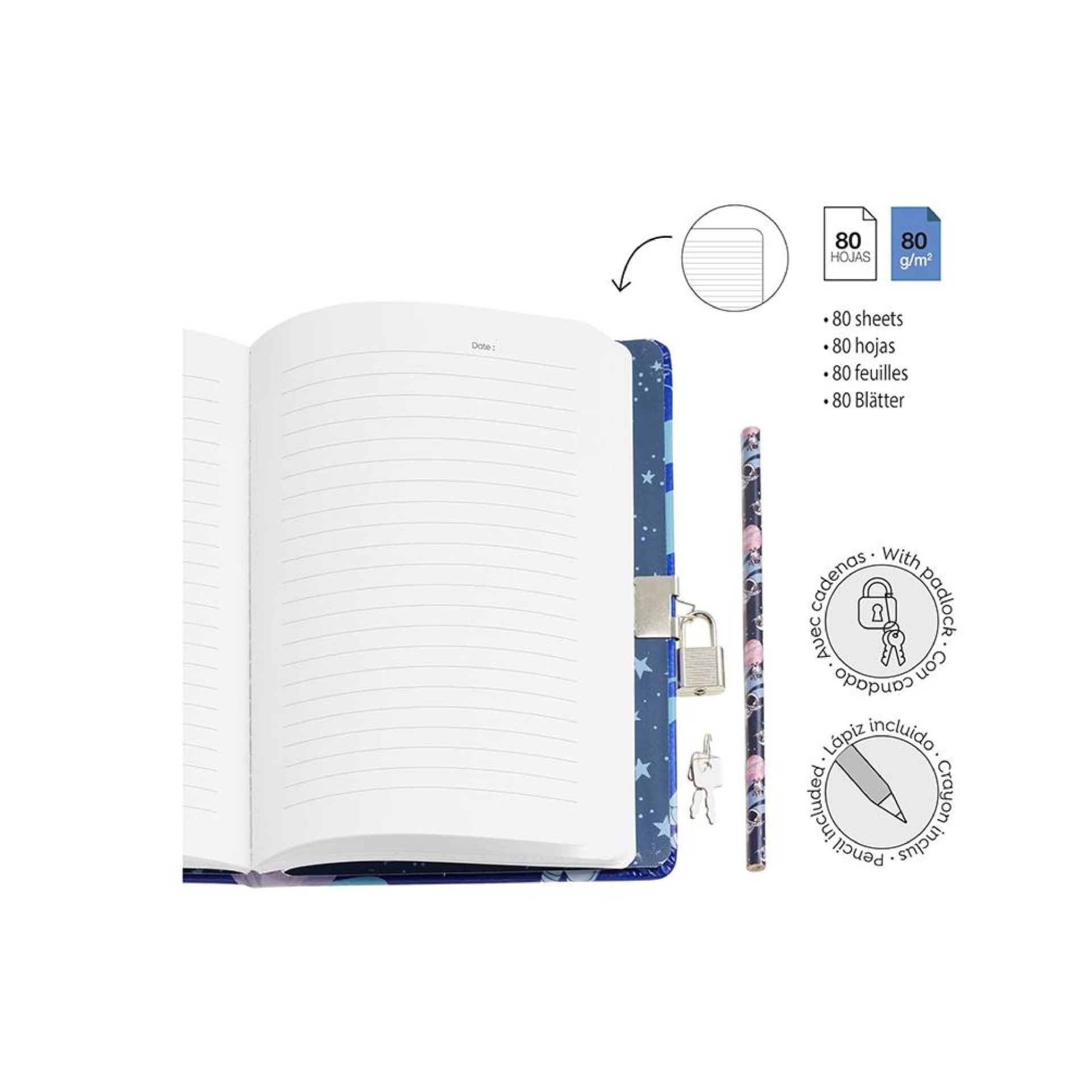 Diário incrível com capa holográfica de astronauta, perfeito para guardar todos os teus segredos! Inclui cadeado e lápis para uma experiência completa. ✨
