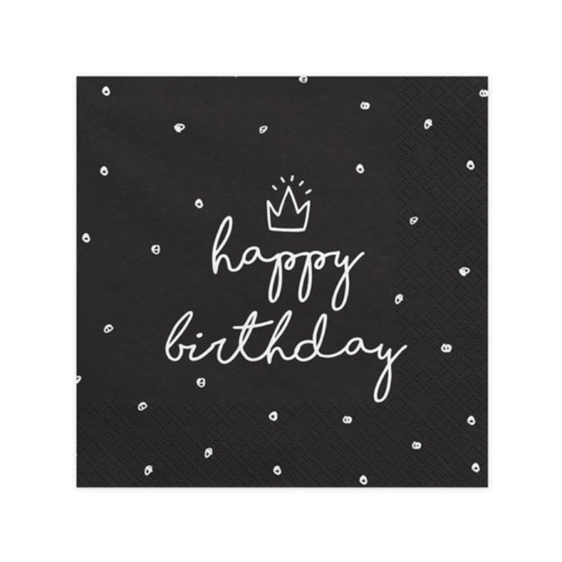 Características: Cor: Preto com letras brancas e coroa Mensagem: Happy Birthday Medida: 33 x 33 cm Material: Papel de 3 folhas Quantidade: 20 unidades Ideais para aniversários e celebrações especiais