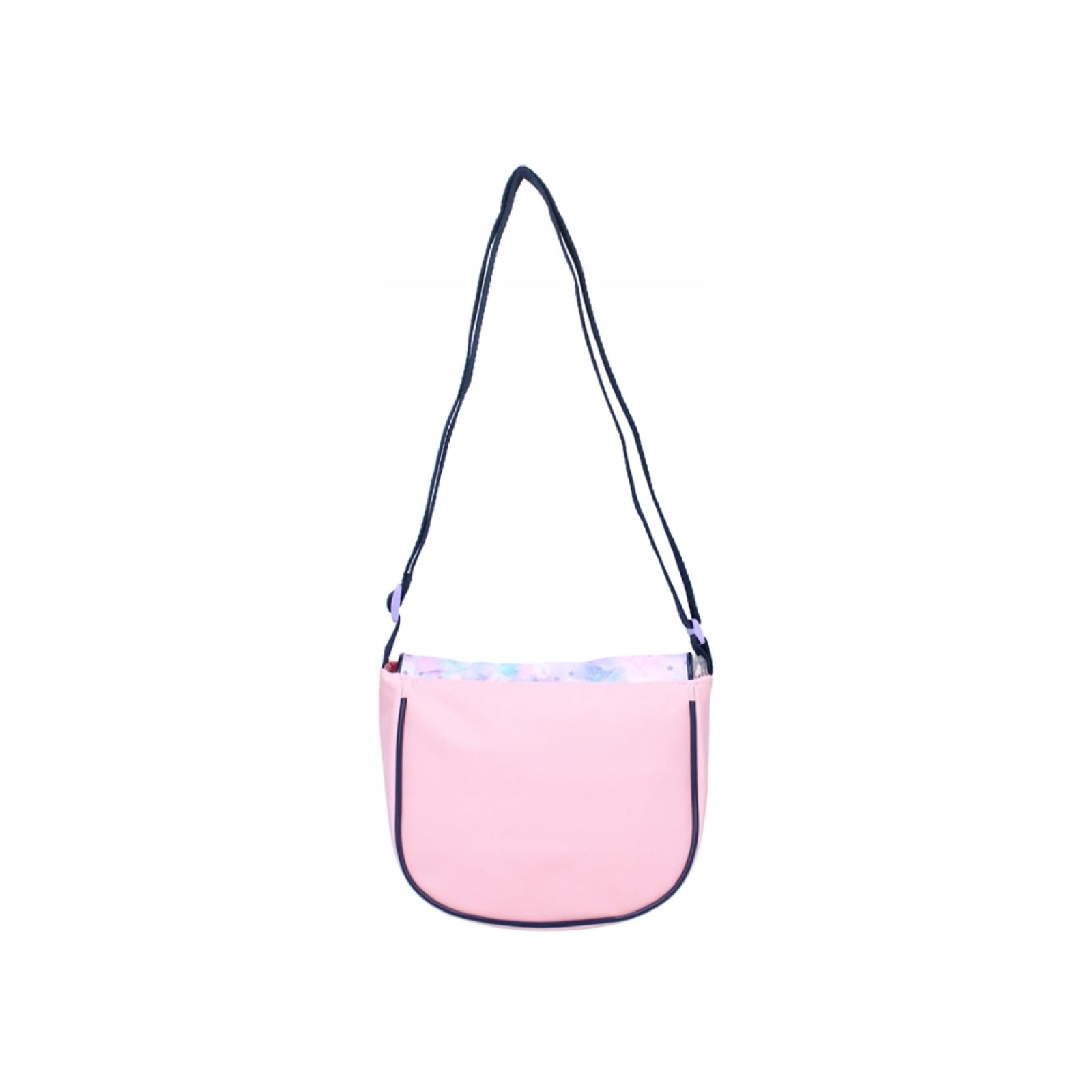 A bolsa tem uma mistura divertida de tons de rosa e roxo e é decorada com divertidos detalhes de estrelas.