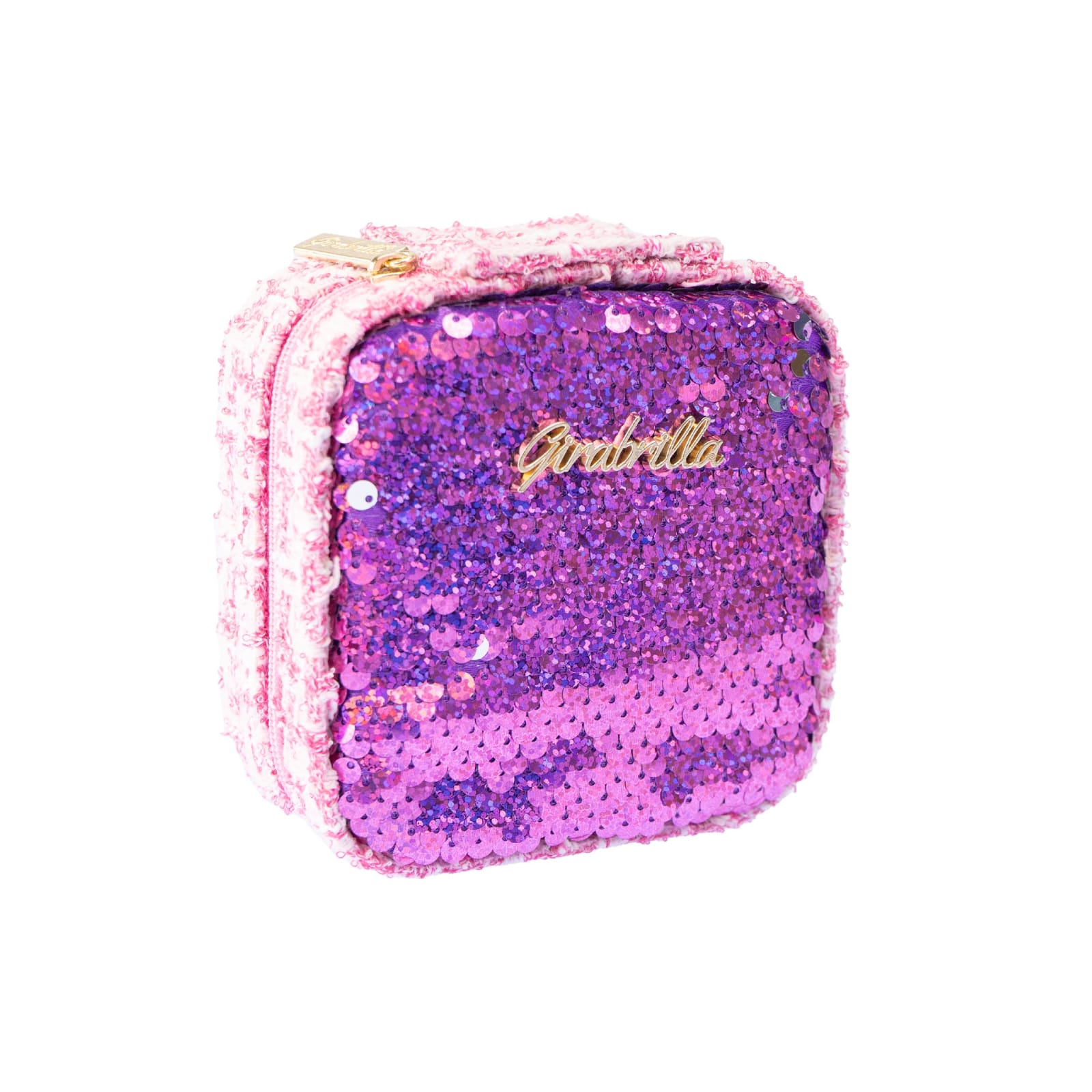 Enriquecido com lantejoulas Girabrilla, acabamentos em tecido tweed e resselável com zíper.