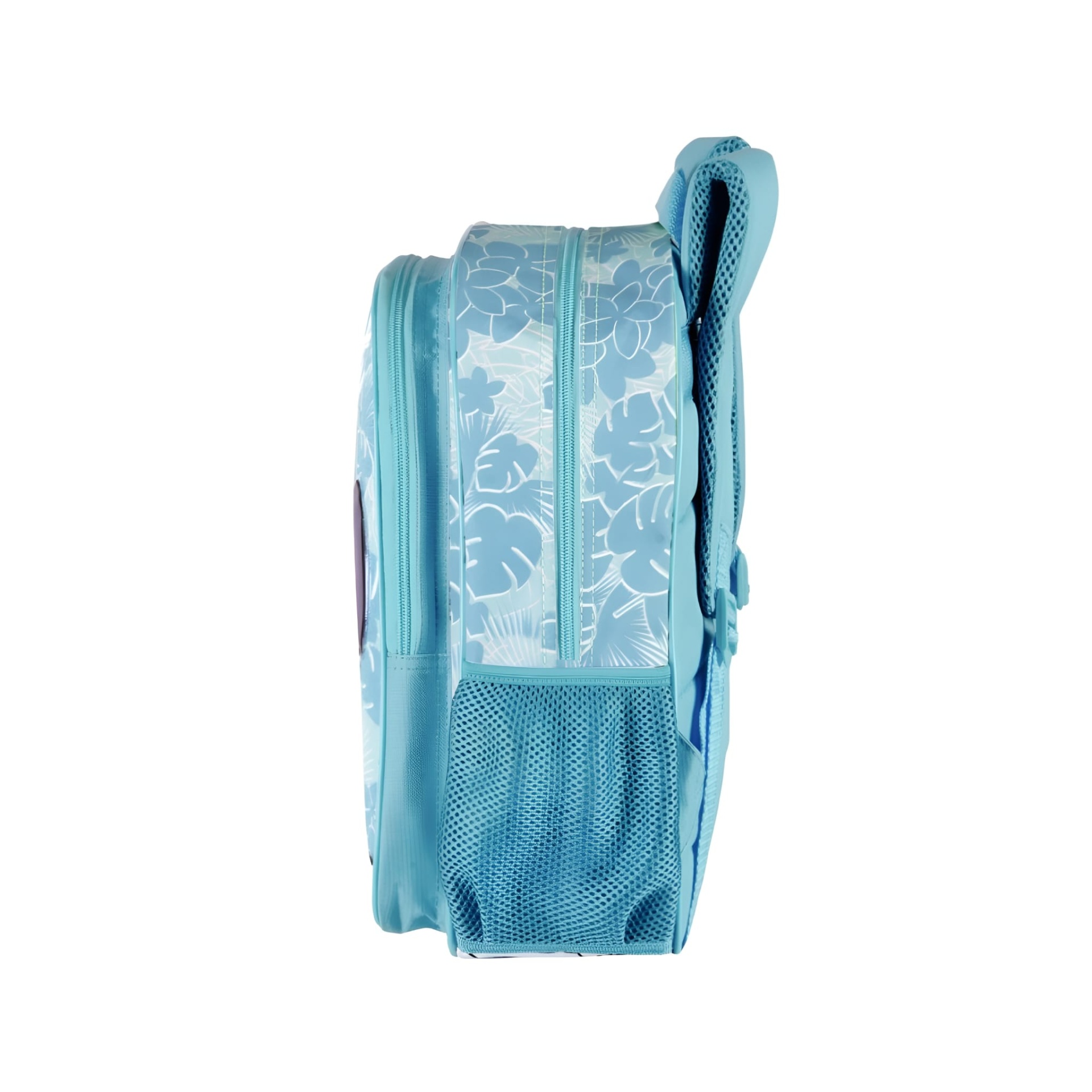 Design especial Stitch em relevo, amplo espaço com fecho de zíper e puxador de tecido, bolso frontal com zíper e puxador de tecido, bolso lateral de malha, forro interno, alças acolchoadas com tamanho ajustável, protetor traseiro acolchoado, alça superior e cartão de identificação pessoal.