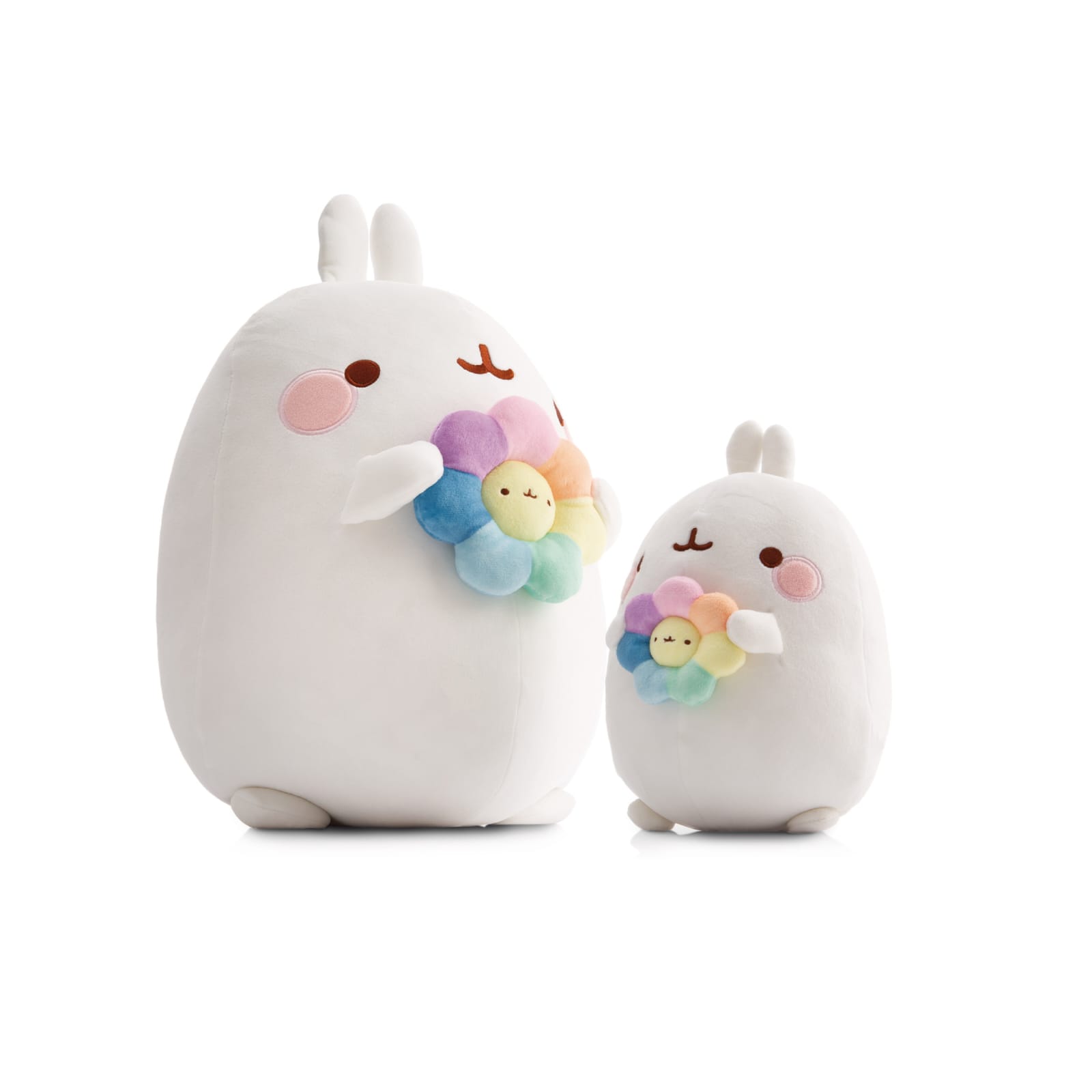 Com uma flor de arco-íris em tons pastéis nas mãos, seu rostinho extremamente fofo e o recheio particularmente fofinho, Molang se aconchega no coração de todas as crianças.