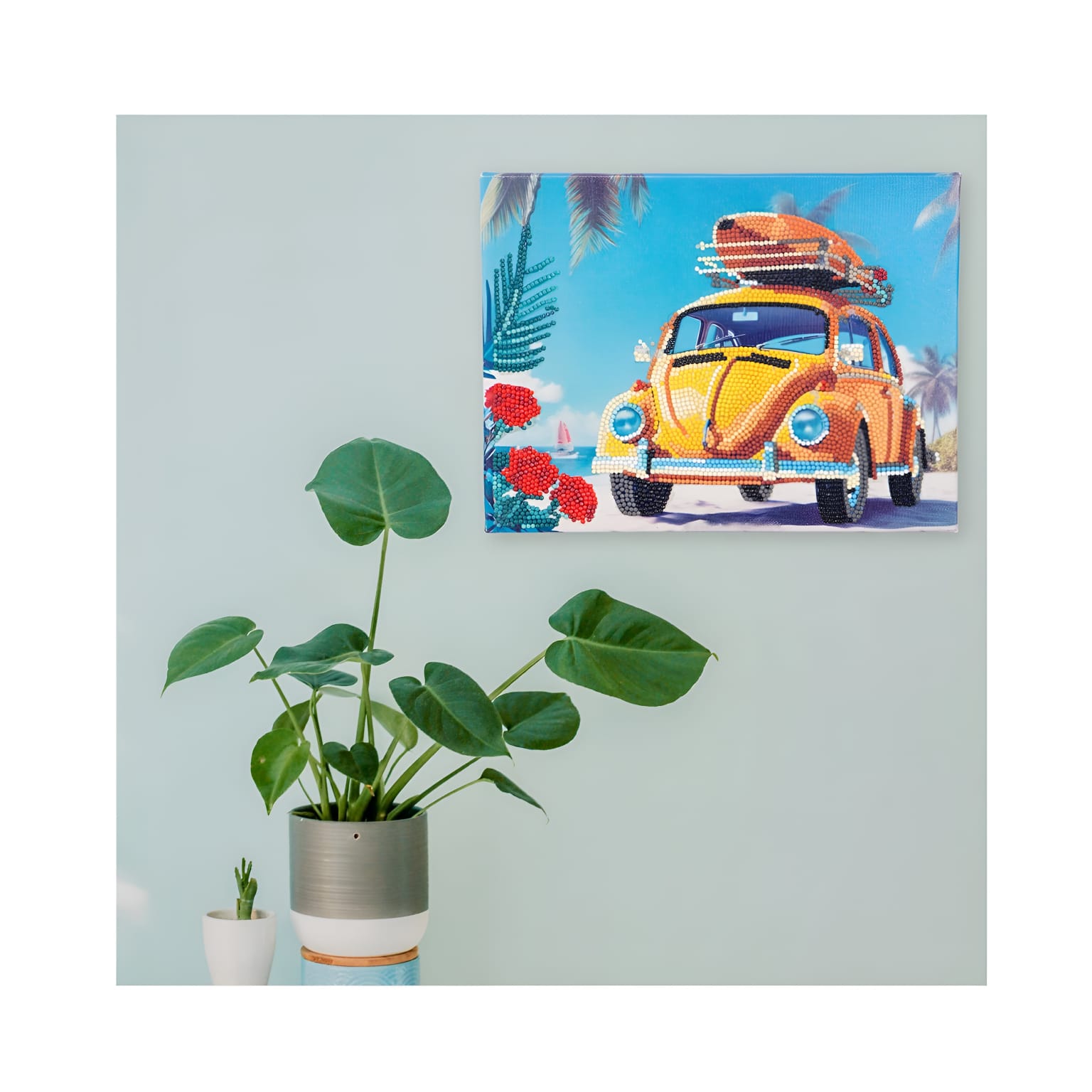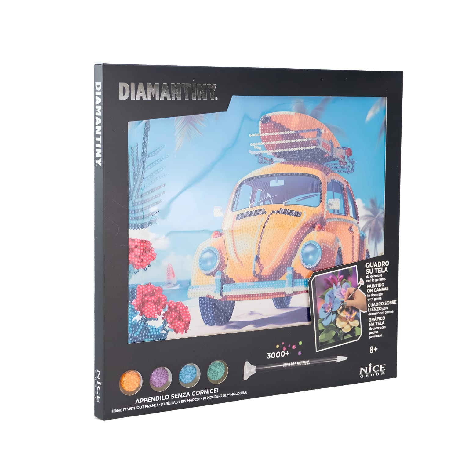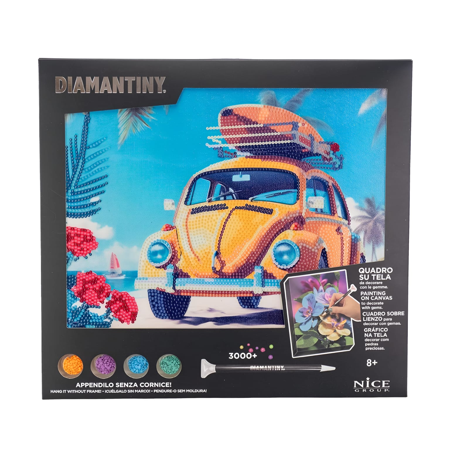Imagens decorativas e icônicas diretamente em uma moldura pronta para ser pendurada depois de concluída. O pano sobre o qual as gemas são aplicadas é suportado por uma pastilha rígida para permitir a perfeita adesão das gemas.
