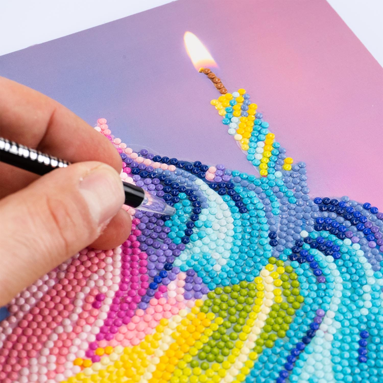 CONTEÚDO: 1 quadro com base adesiva e guia de cores, 3000+ cristais coloridos e gemas especiais, 1 bandeja coletora, 1 caneta aplicadora e 1 quadrado de cera.