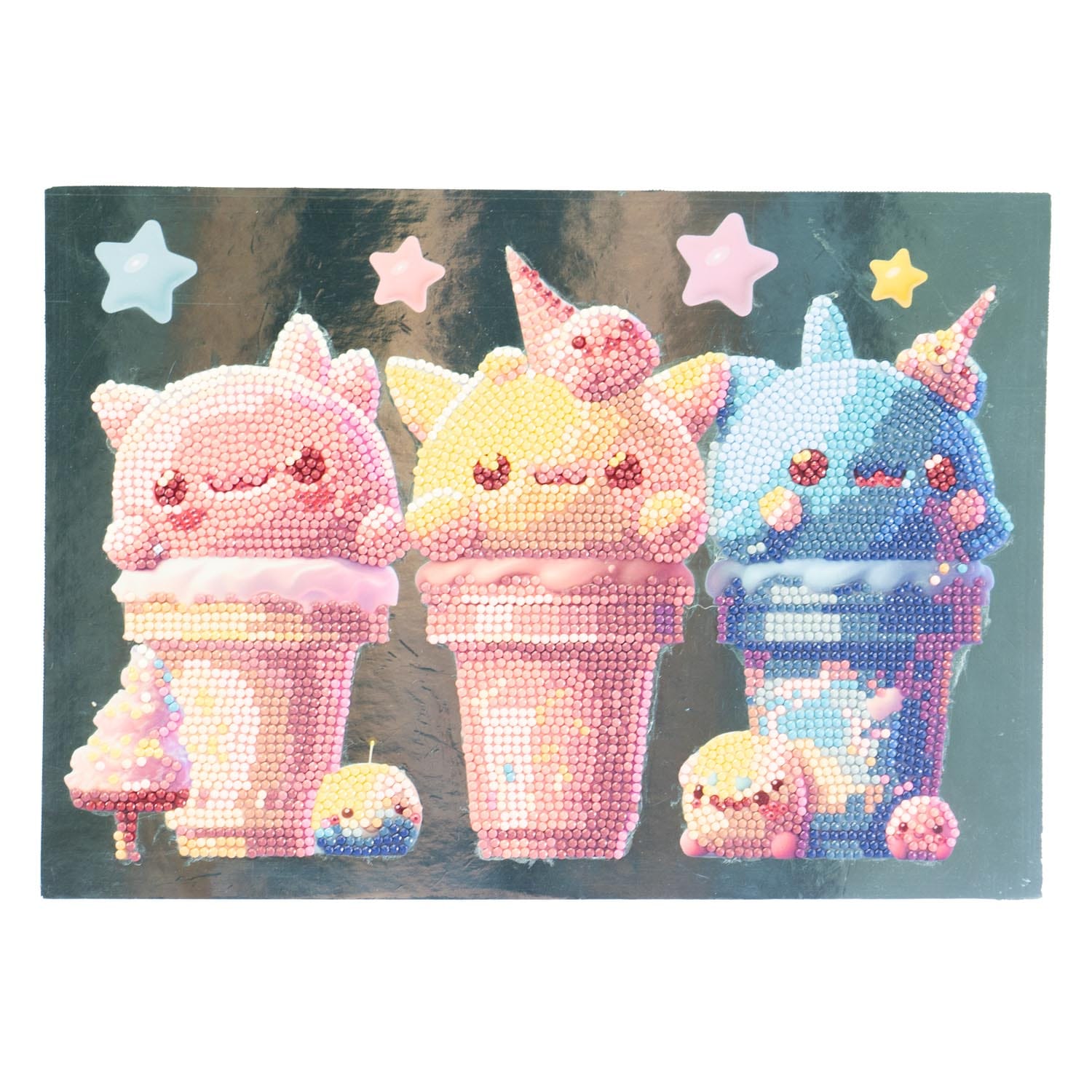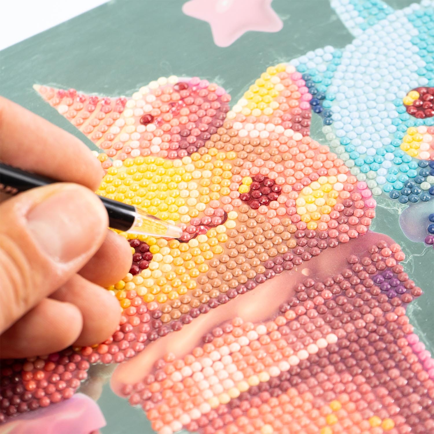 CONTEÚDO: 1 quadro com base adesiva e guia de cores, 3000+ cristais coloridos e gemas especiais, 1 bandeja coletora, 1 caneta aplicadora e 1 quadrado de cera.