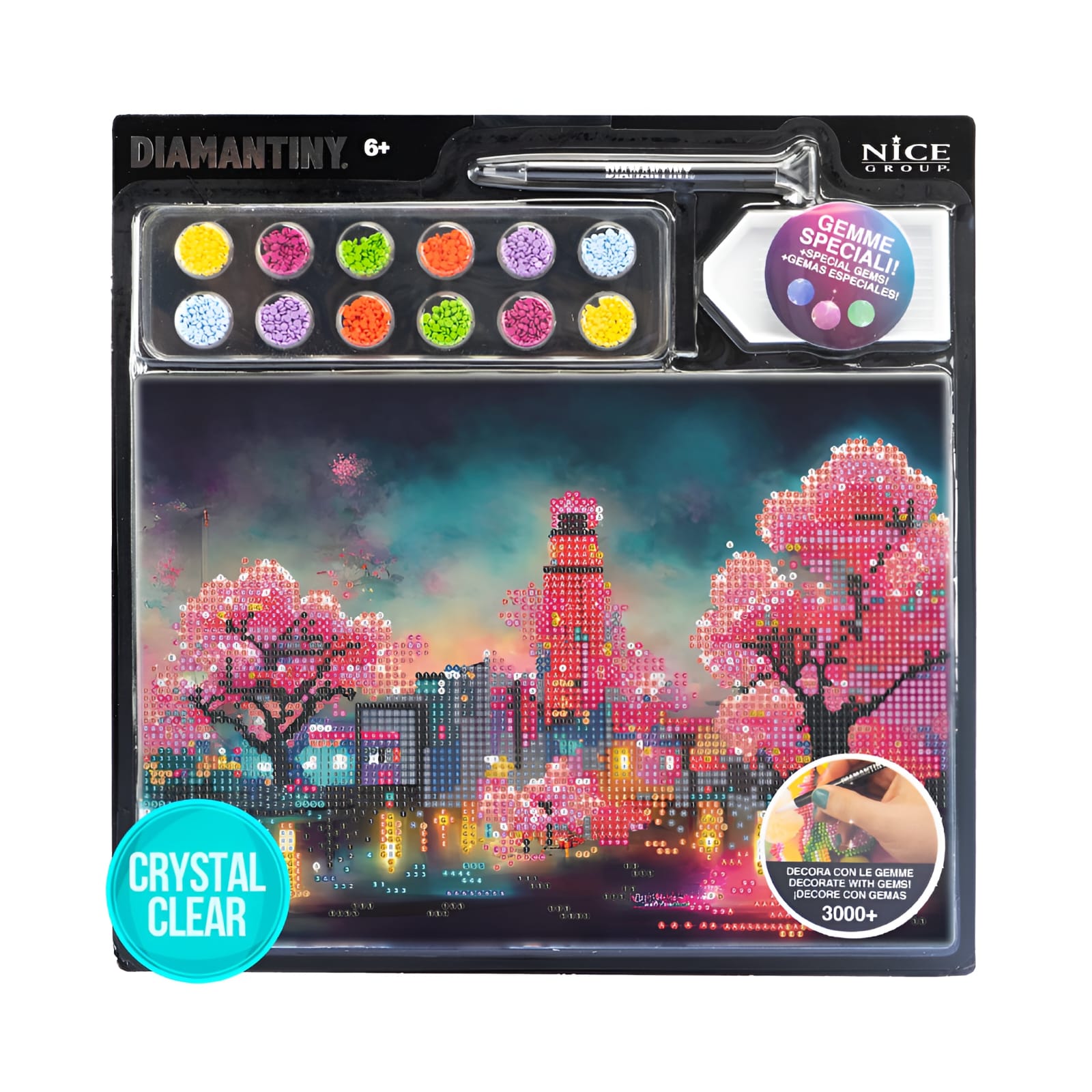 CONTEÚDO: 1 quadro com base adesiva e guia de cores, 3000+ cristais coloridos e gemas especiais, 1 bandeja coletora, 1 caneta aplicadora e 1 quadrado de cera.