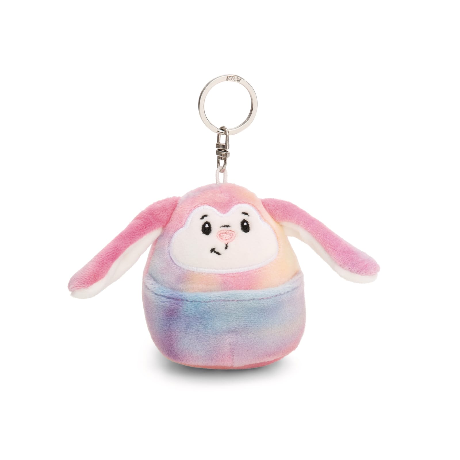 O fofo coelho NICI em cores brilhantes do arco-íris com orelhas longas e caídas é feito de material de pelúcia elástico NICI fofo e de alta qualidade e pode ser preso a um chaveiro, mochila ou bolsa como um chaveiro fofinho com a ajuda da argola de metal resistente.