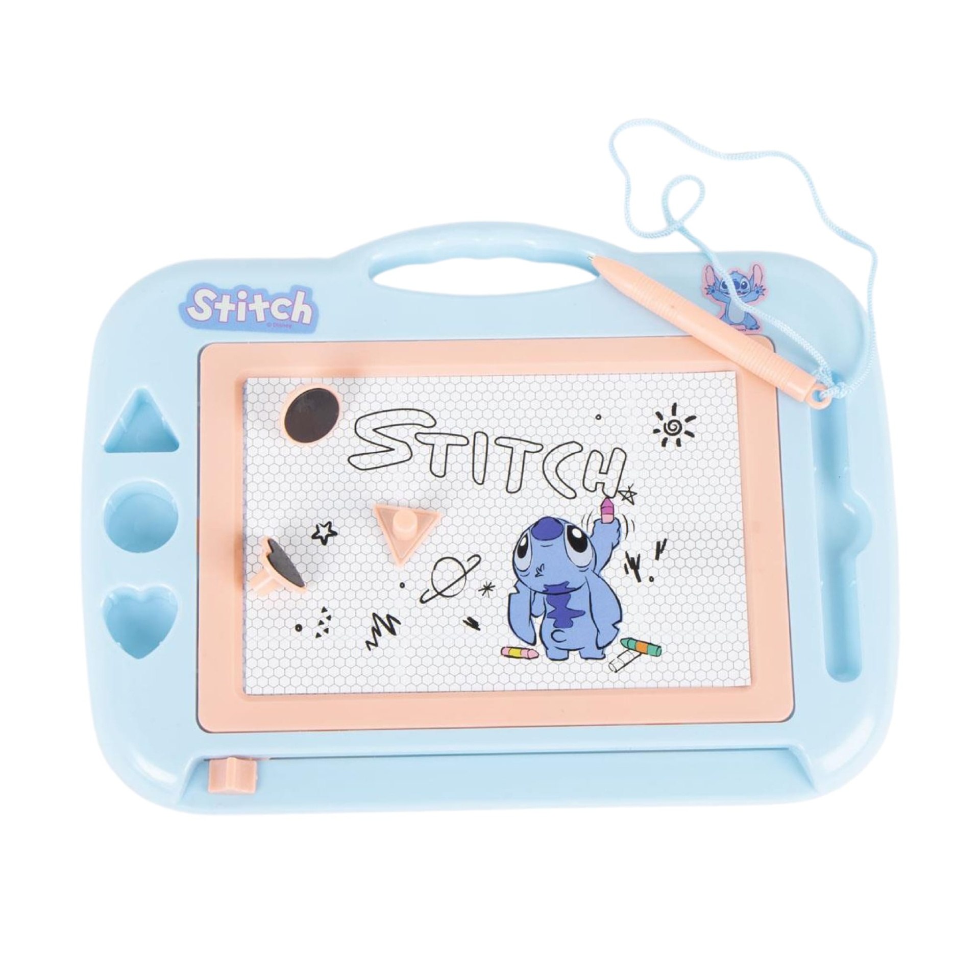 Com este quadro magnético portátil do Stitch, as crianças podem desenhar e apagar quantas vezes quiserem. Basta usar a caneta incluída para criar, e depois deslizar o botão para apagar e começar de novo. Perfeito para estimular a imaginação e a motricidade fina, em casa ou durante viagens.