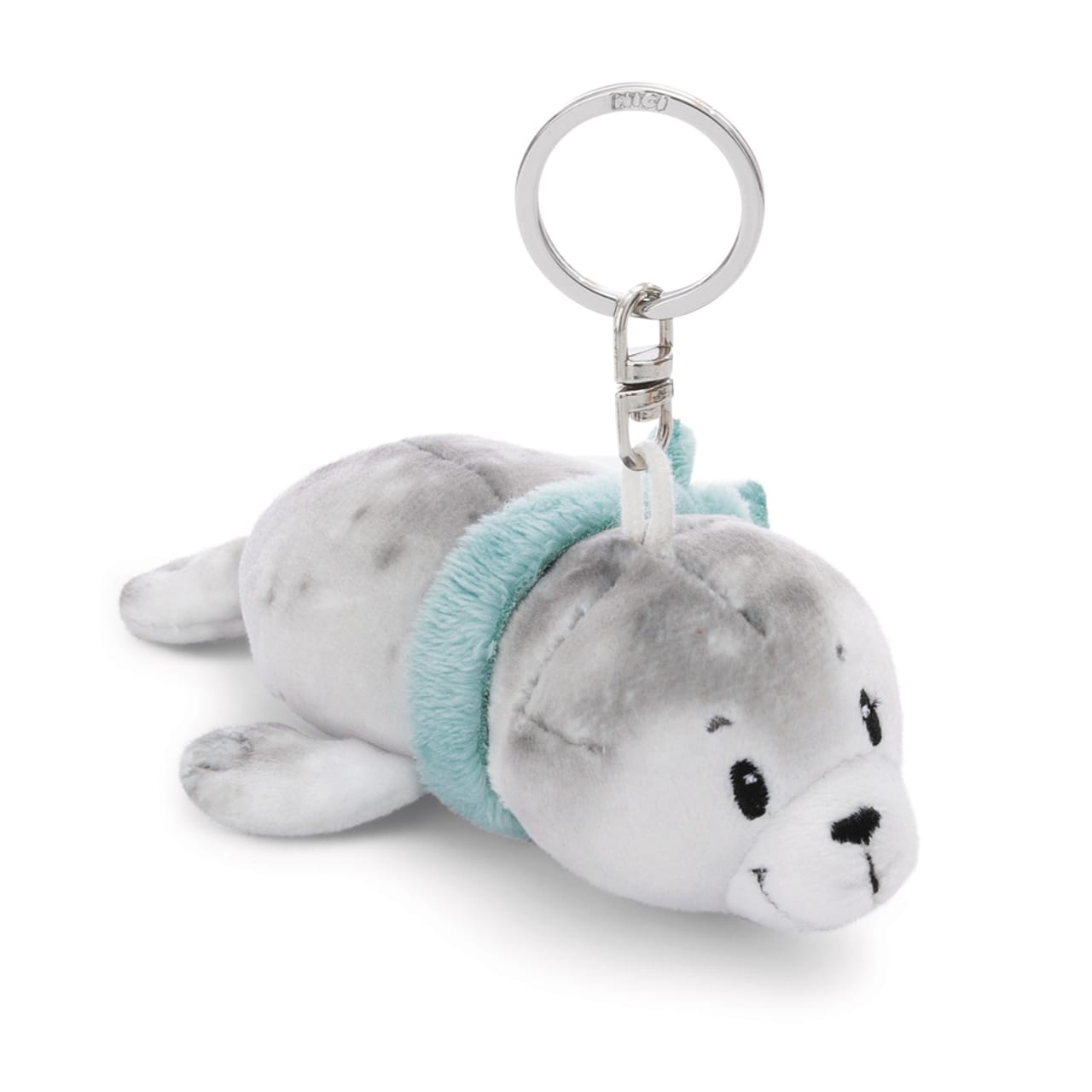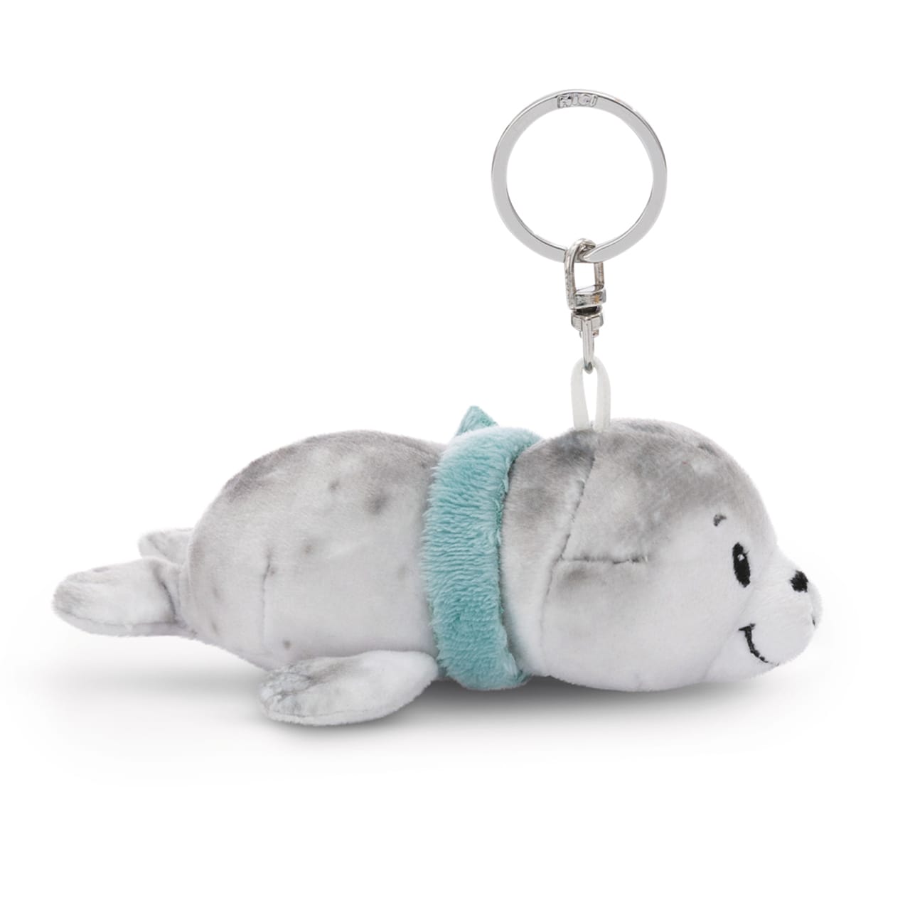 O mamífero marinho cinza com o lenço turquesa em volta do pescoço é um porta-chaves de pelúcia que pode ser levado para qualquer lugar.