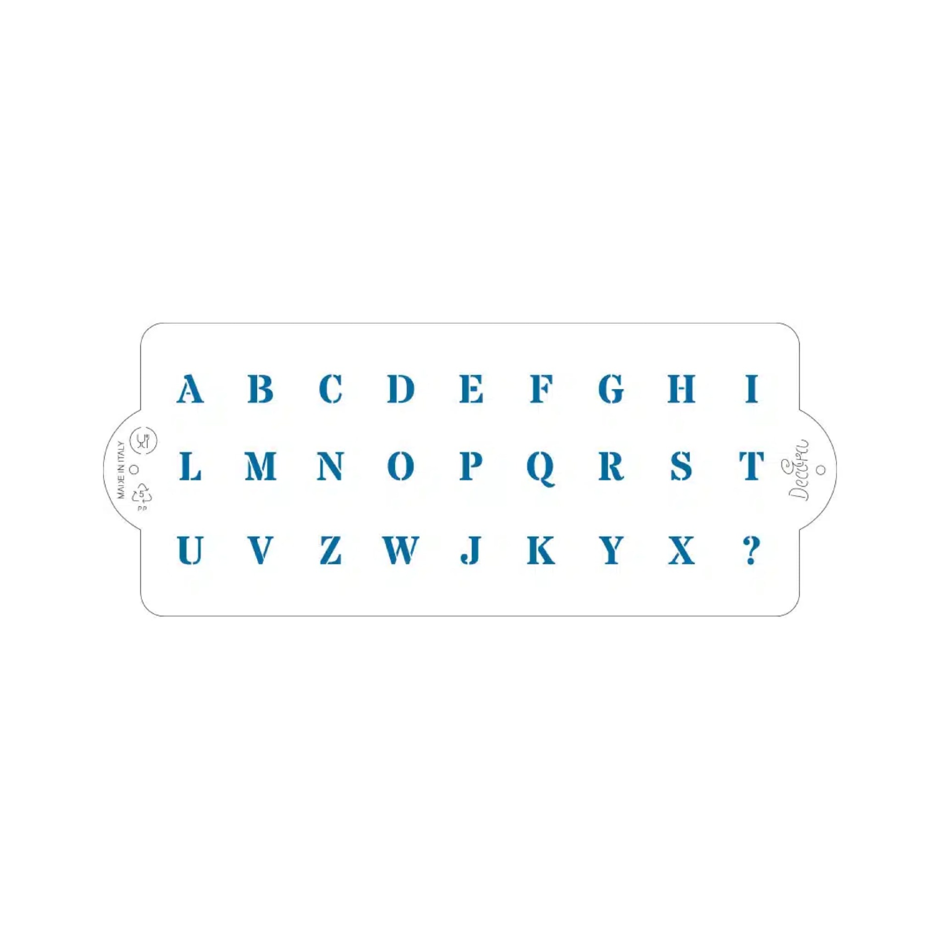 Stencil com alfabeto completo da marca Decora, ideal para decorar bolos, bolachas, cupcakes e outras criações de pastelaria.