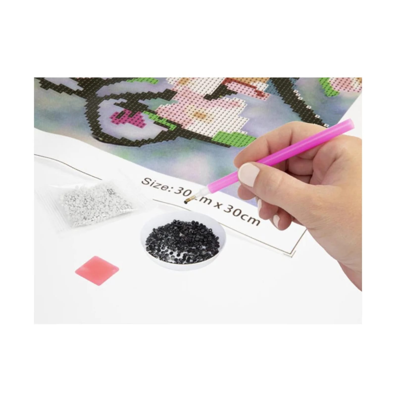 O Kit Contém: Tela adesiva (30x30cm): Facilita a aplicação dos mosaicos diamante. Mosaicos coloridos: Pacotes numerados com todas as cores necessárias para completar o desenho. Recipiente plástico: Para organizar os mosaicos enquanto trabalha. Caneta aplicadora e cola: Ferramentas práticas para aplicar os mosaicos com precisão. Manual de instruções: Inclui esquema de cores e desenho guia diretamente na tela. Moldura incluída: Para esticar a tela e manter seu trabalho impecável.