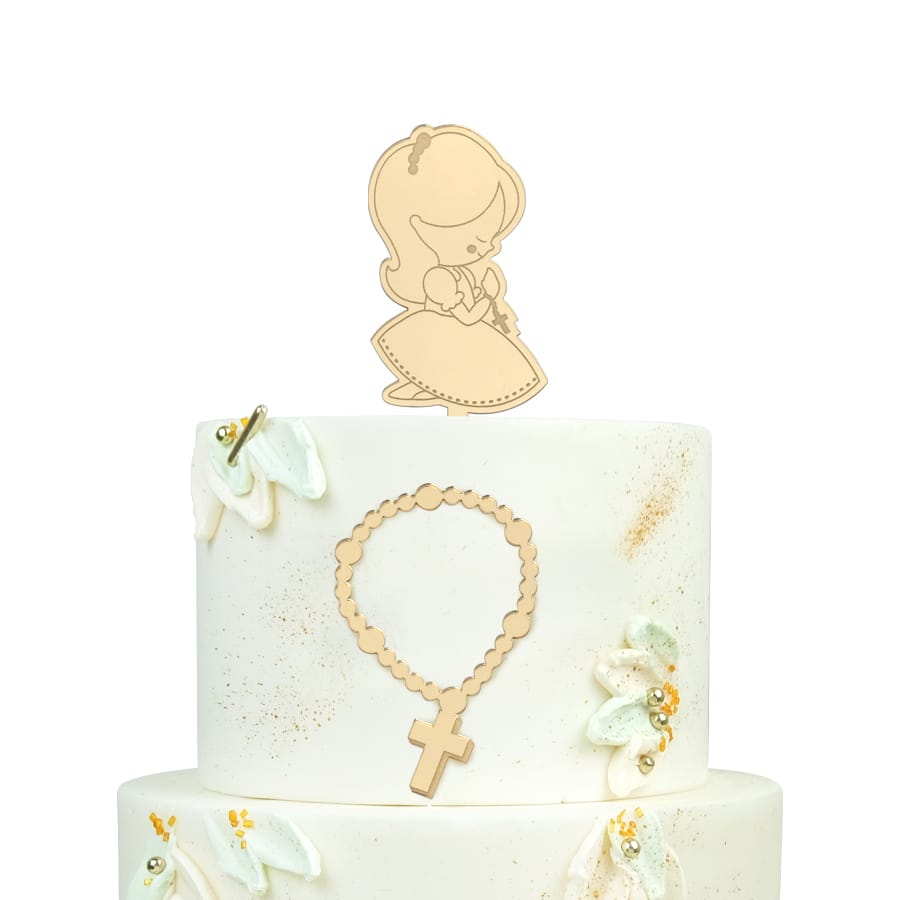 Celebre momentos de Fé com elegância e significado com o Topper/Aplique Menina com Terço – Ouro. Perfeito para decorar bolos de Comunhões, Batizados, Profissões de Fé e Crisma, acrescenta um toque delicado, moderno e cheio de simbolismo à sua celebração.