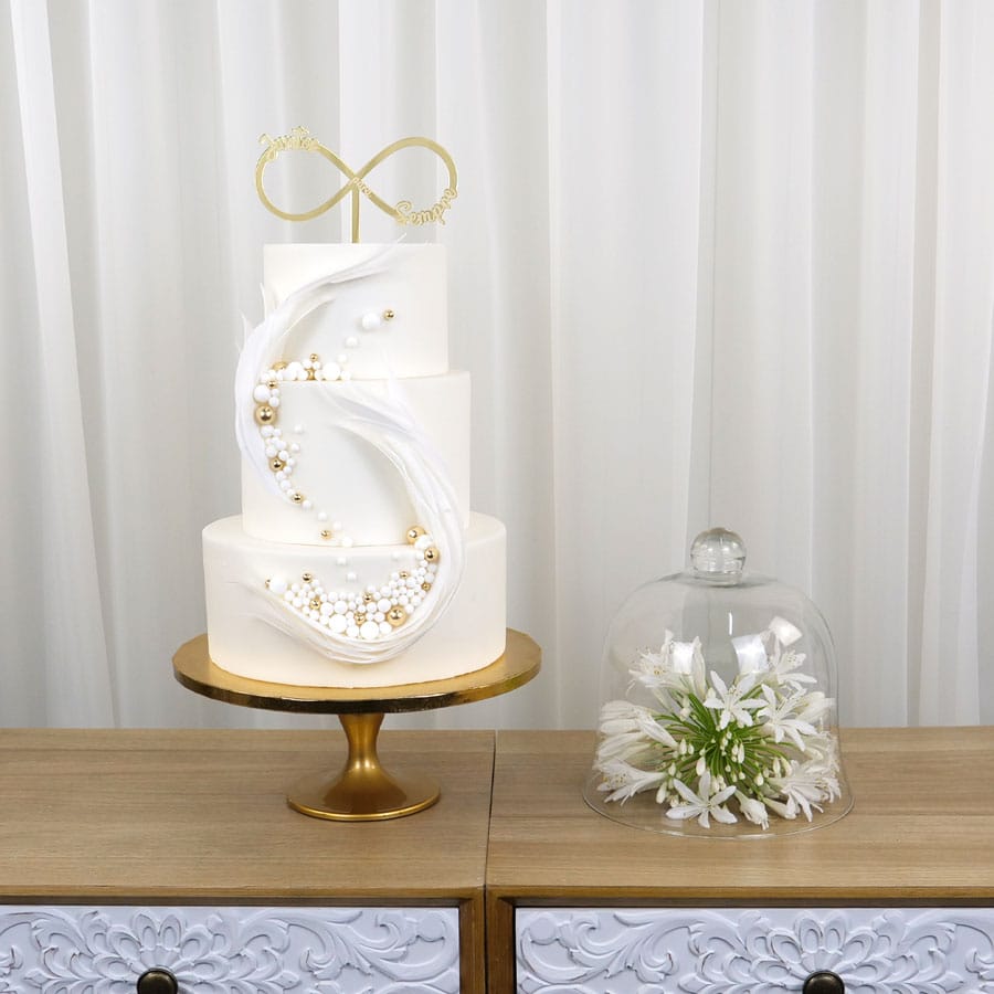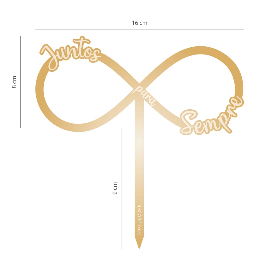Celebre o amor eterno com o topper “Juntos para Sempre”, acompanhado pelo delicado símbolo do infinito na sofisticada cor dourada. Um detalhe cheio de significado, perfeito para casamentos, bodas ou renovação de votos.