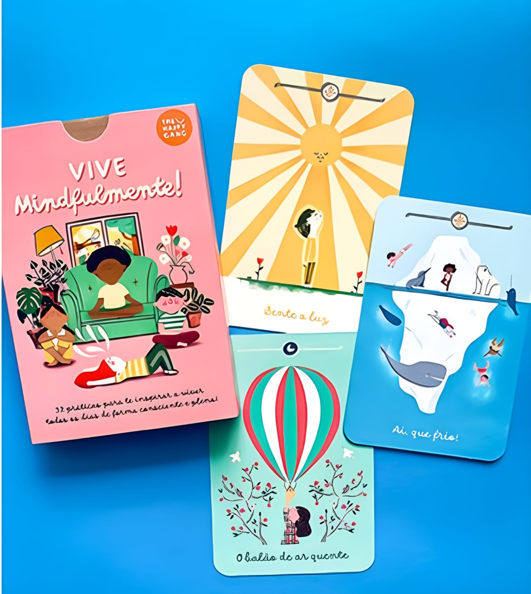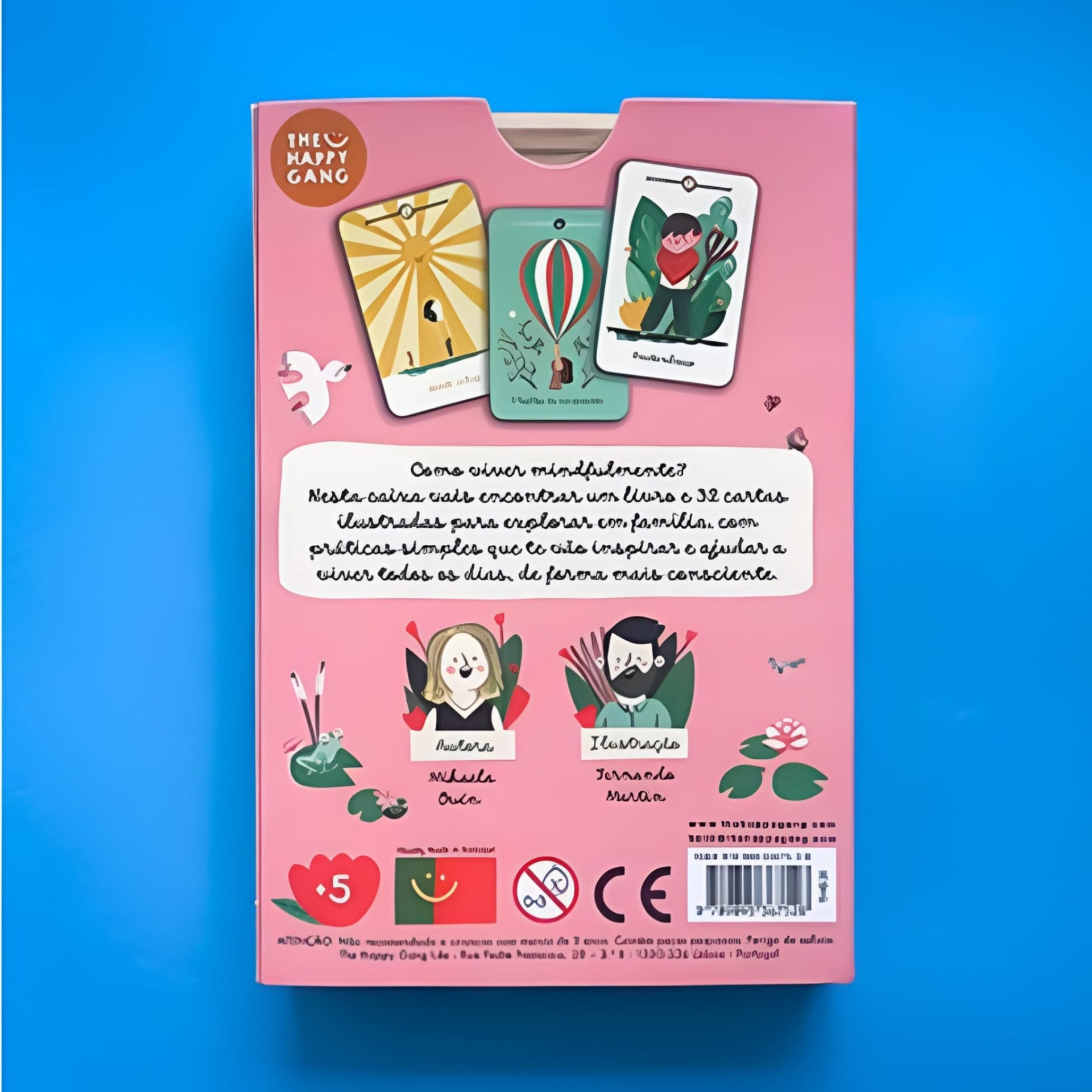 Nesta caixa vais encontrar 1 livro e 32 cartas ilustradas para explorar em família, com práticas simples que te vão inspirar e ajudar a viver todos os dias, de forma mais consciente e plena.